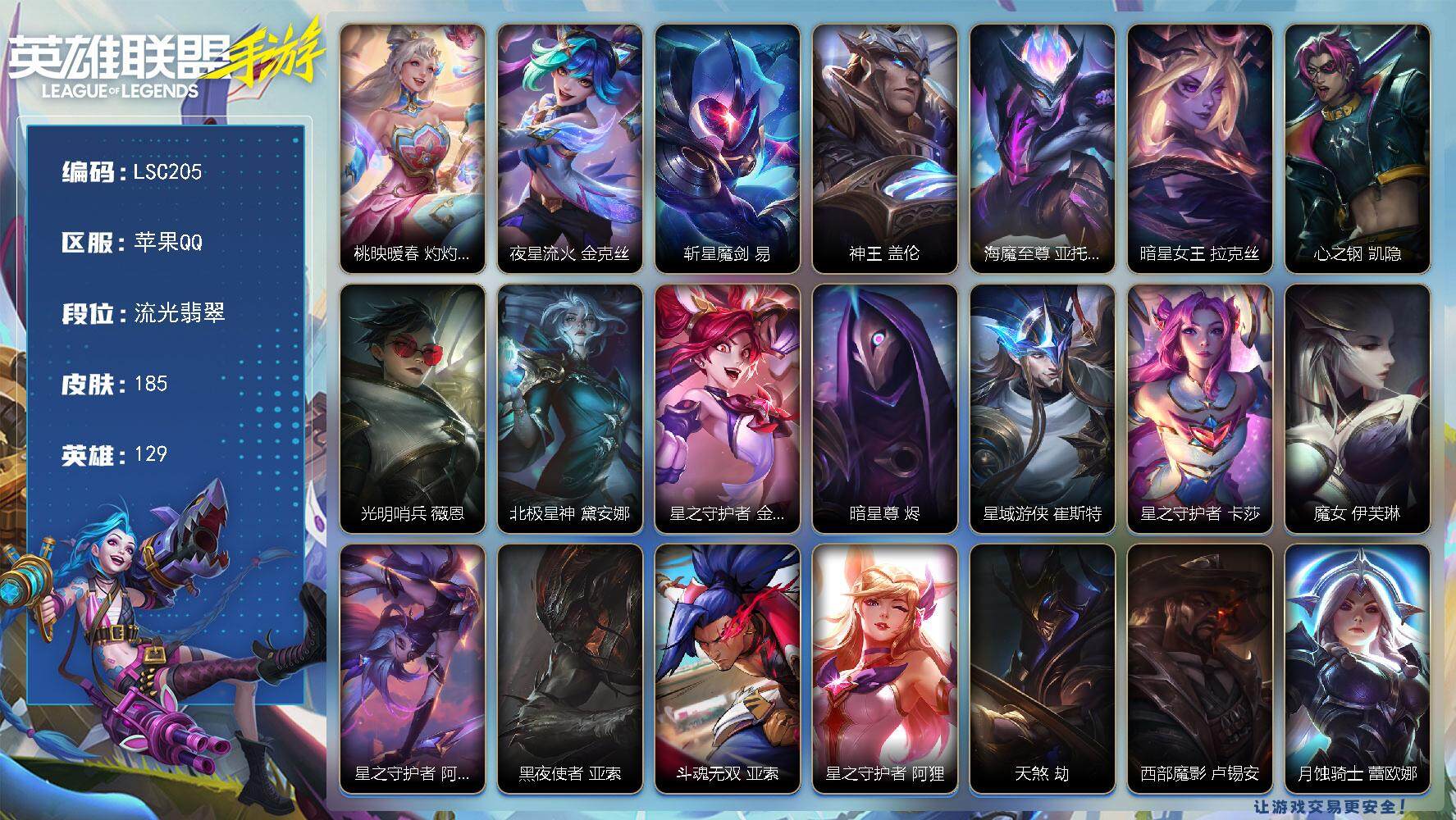 【LSC205】129英雄/185皮肤/2神话/38传说/85史诗/流光翡翠/桃映暖春 灼灼芳菲 拉克丝/夜星流火 金克丝/斩星魔剑 易/神王 盖伦/海魔至尊 亚托克斯/暗星女王 拉克丝/心之钢 凯隐/光明哨兵 薇恩/北极星神 黛安娜/星之守护者 金克丝/暗星尊 烬/星域游侠 崔斯特/星之守护者 卡莎/魔女 伊芙琳/星之守护者 阿卡丽/黑夜使者 亚索/斗魂无双 亚索/星之守护者 阿狸/天煞 劫/西部魔影 卢锡安/月蚀骑士 蕾欧娜/驯龙炮手 崔丝塔娜/星之守护者 落 霞/星之守护者 陨 洛/神拳 李青/神龙尊者 圣龙 李青/律政大亨 蒙多医生/福牛守护者 厄运小姐/跳跳倩影 厄运小姐/光电璀璨