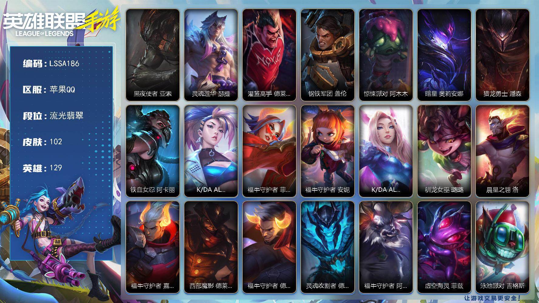 【LSSA186】129英雄/102皮肤/3传说/24史诗/流光翡翠/黑夜使者 亚索/灵魂莲华 瑟提/灌篮高手 德莱厄斯/钢铁军团 盖伦/惊悚派对 阿木木/暗星 奥莉安娜/猎龙勇士 潘森/铁血女忍 阿卡丽/K/DA ALL OUT 阿卡丽/福牛守护者 菲奥娜/福牛守护者 安妮/K/DA ALL OUT 阿狸/驯龙女巫 璐璐/晨星之翎 洛/福牛守护者 嘉文四世/西部魔影 德莱厄斯/福牛守护者 德莱厄斯/灵魂收割者 德莱文/福牛守护者 阿利斯塔/虚空海灵 菲兹/泳池派对 吉格斯/光明哨兵 锐雯/地狱火 加里奥/神奇先驱 杰斯/真实伤害 赛娜/怨之砂 派克/古神 沃里克/s1光耀之刃/s2光耀之芒