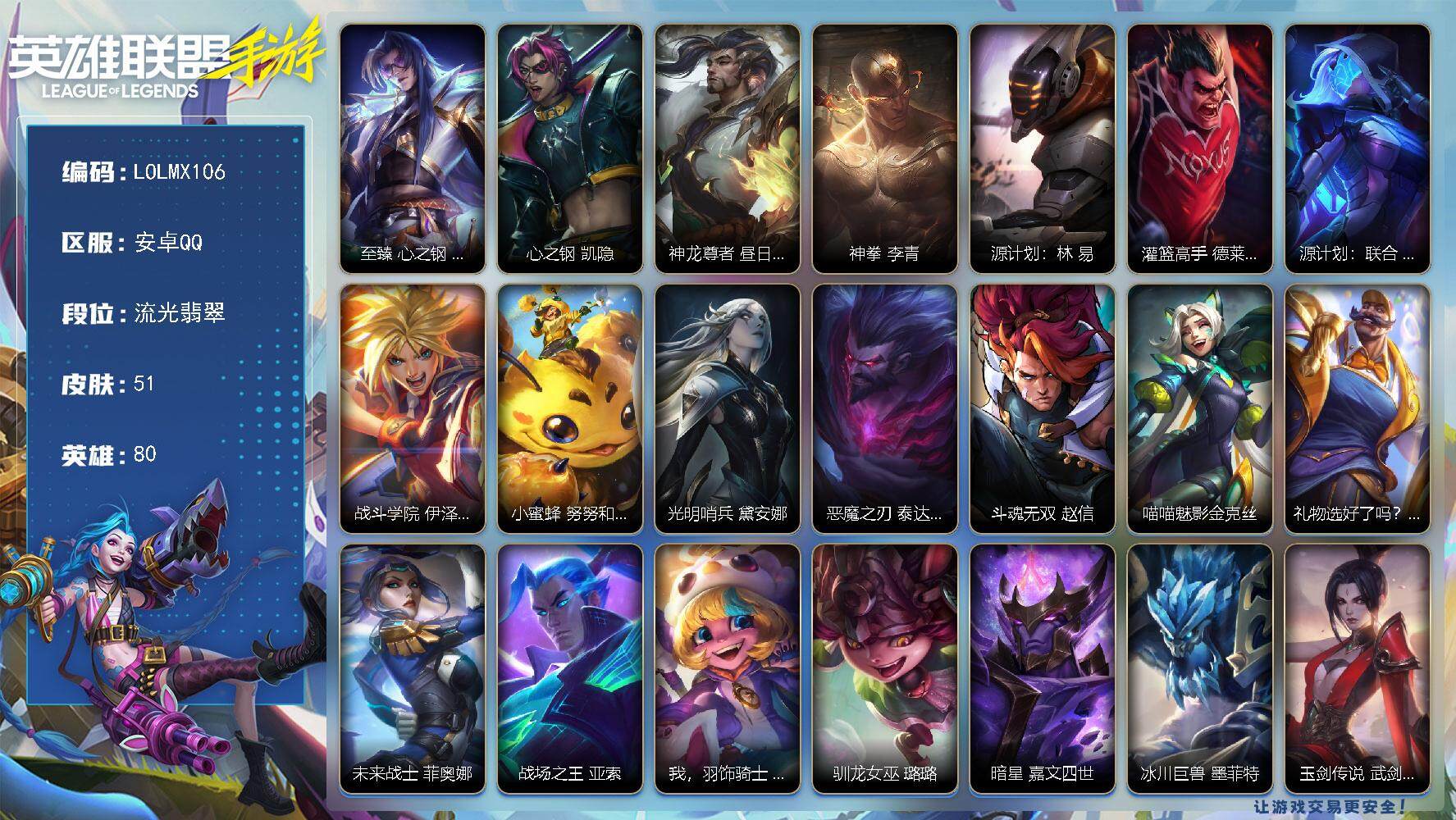 【LOLMX106】80英雄/51皮肤/流光翡翠/至臻 心之钢 永恩/心之钢 凯隐/神龙尊者 昼日真龙 亚索/神拳 李青/源计划:林 易/灌篮高手 德莱厄斯/源计划:联合 艾希/战斗学院 伊泽瑞尔/小蜜蜂 努努和威朗普/光明哨兵 黛安娜/恶魔之刃 泰达米尔/斗魂无双 赵信/喵喵魅影金克丝/礼物选好了吗? 布隆/未来战士 菲奥娜/战场之王 亚索/我,羽饰骑士 崔丝塔娜/驯龙女巫 璐璐/暗星 嘉文四世/冰川巨兽 墨菲特/玉剑传说 武剑仙 锐雯/星之守护者COS 厄加特/奈落之炎 慎/怨之砂 派克/宇航员 诺提勒斯/s6绯金丽刃/s11王牌司令/s12龙冕先锋/s13龙冕御盾/s14龙冕神策/s1