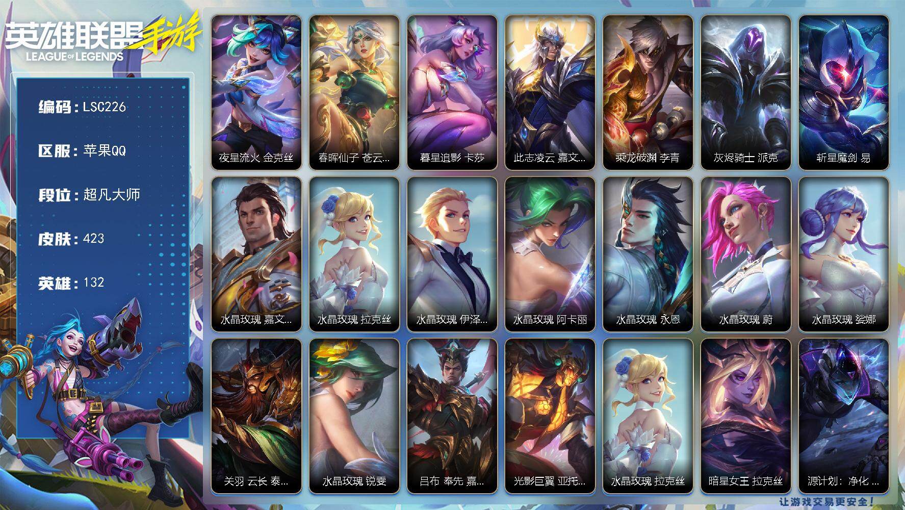 【LSC226】132英雄/423皮肤/6神话/58传说/229史诗/超凡大师/夜星流火 金克丝/春晖仙子 苍云缥缈 卡莎/暮星追影 卡莎/此志凌云 嘉文四世/乘龙破渊 李青/灰烬骑士 派克/斩星魔剑 易/水晶玫瑰 嘉文四世/水晶玫瑰 拉克丝/水晶玫瑰 伊泽瑞尔/水晶玫瑰 阿卡丽/水晶玫瑰 永恩/水晶玫瑰 蔚/水晶玫瑰 娑娜/关羽 云长 泰达米尔/水晶玫瑰 锐雯/吕布 奉先 嘉文四世/光影巨翼 亚托克斯/暗星女王 拉克丝/源计划:净化 薇恩/光明哨兵 薇恩/北极星神 黛安娜/星之守护者 金克丝/暗星尊 烬/星域游侠 崔斯特/水晶玫瑰 卡莎/魔女 伊芙琳/星之守护者 阿卡丽/太空律动 “猫猫”