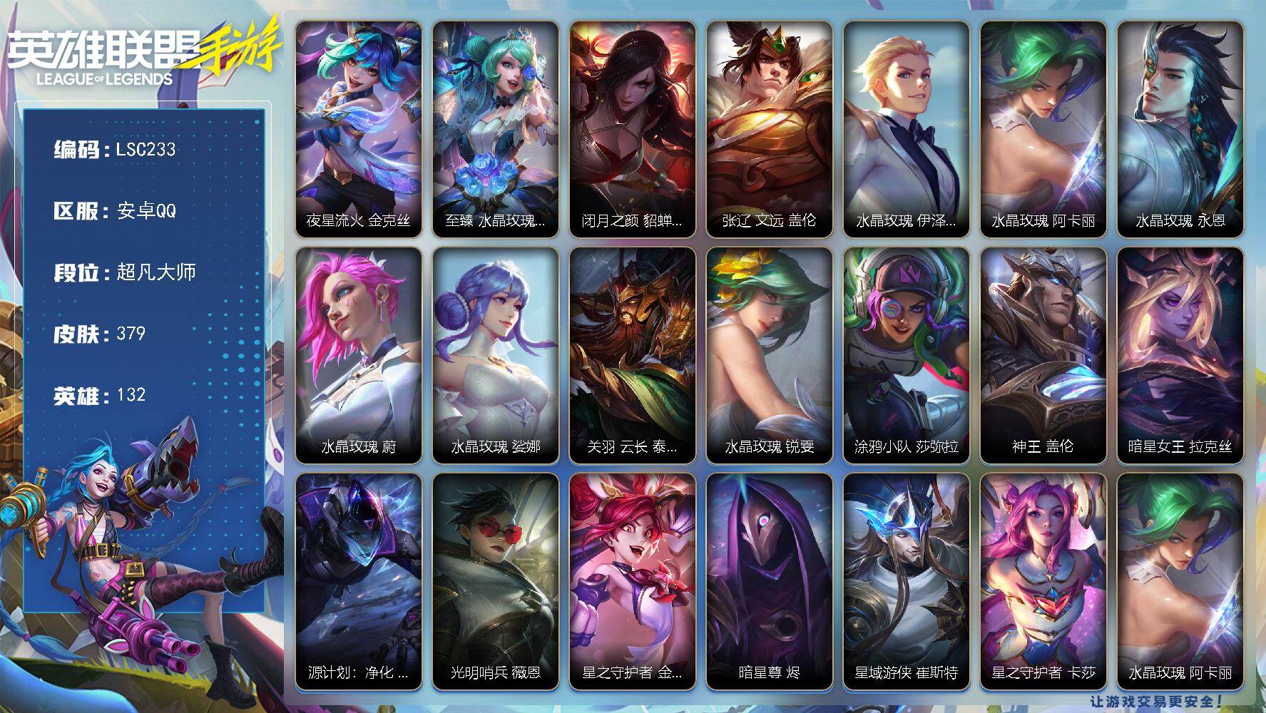 【LSC233】132英雄/379皮肤/2神话/49传说/219史诗/超凡大师/夜星流火 金克丝/至臻 水晶玫瑰 格温/闭月之颜 貂蝉 卡特琳娜/张辽 文远 盖伦/水晶玫瑰 伊泽瑞尔/水晶玫瑰 阿卡丽/水晶玫瑰 永恩/水晶玫瑰 蔚/水晶玫瑰 娑娜/关羽 云长 泰达米尔/水晶玫瑰 锐雯/涂鸦小队 莎弥拉/神王 盖伦/暗星女王 拉克丝/源计划:净化 薇恩/光明哨兵 薇恩/星之守护者 金克丝/暗星尊 烬/星域游侠 崔斯特/星之守护者 卡莎/星之守护者 阿卡丽/太空律动 “猫猫”布里和里茨 布里茨/K/DA ALL OUT 萨勒芬妮/水晶玫瑰 萨勒芬妮/碧空长歌 萨勒芬妮/源计划:超体 莫德凯撒/黑英雄联盟手游 - 安卓QQ -