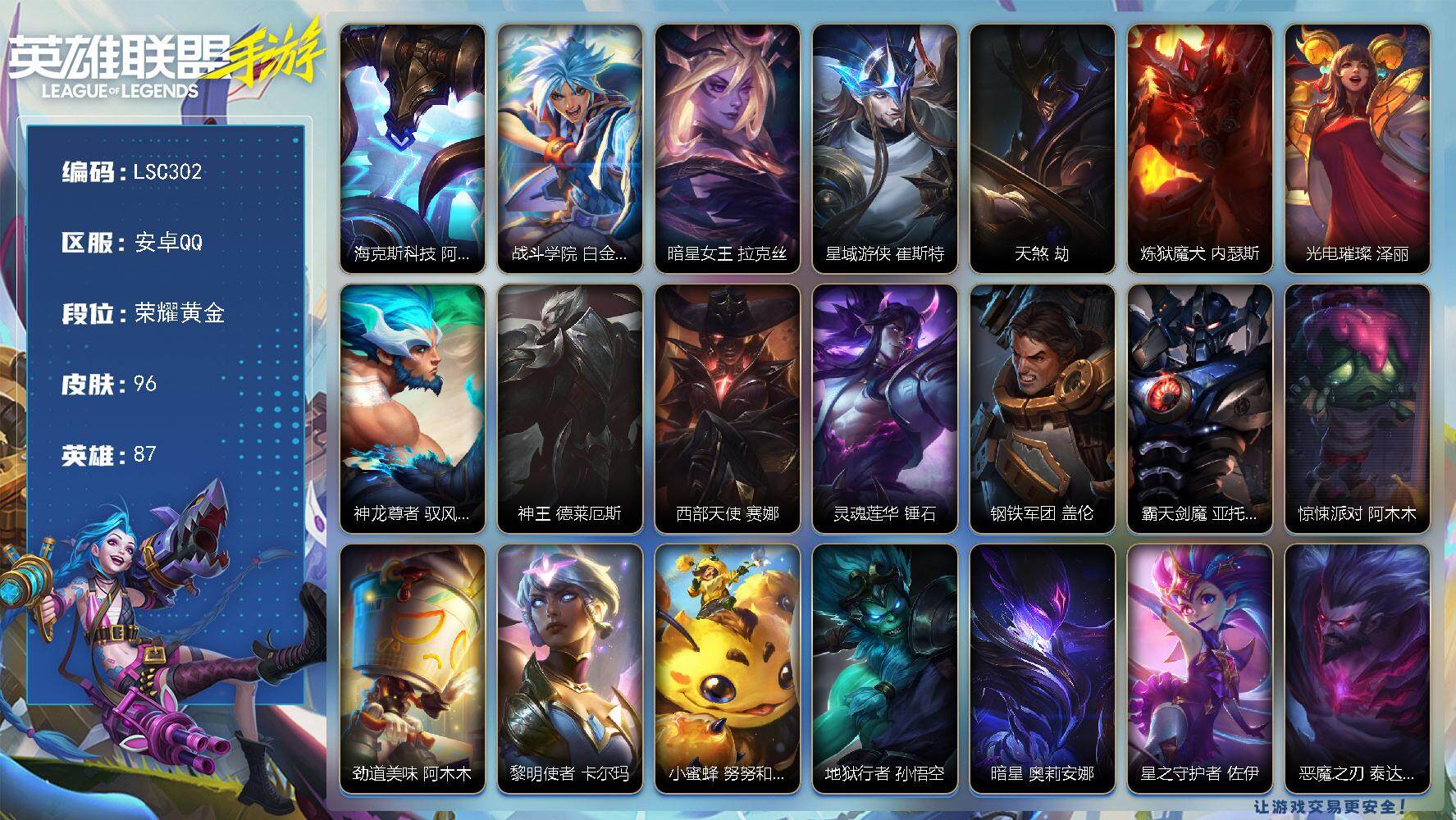 【LSC302】87英雄/96皮肤/荣耀黄金/海克斯科技 阿利斯塔/战斗学院 白金学长 伊泽瑞尔/暗星女王 拉克丝/星域游侠 崔斯特/天煞 劫/炼狱魔犬 内瑟斯/光电璀璨 泽丽/神龙尊者 驭风啸龙 易/神王 德莱厄斯/西部天使 赛娜/灵魂莲华 锤石/钢铁军团 盖伦/霸天剑魔 亚托克斯/惊悚派对 阿木木/劲道美味 阿木木/黎明使者 卡尔玛/小蜜蜂 努努和威朗普/地狱行者 孙悟空/暗星 奥莉安娜/星之守护者 佐伊/恶魔之刃 泰达米尔/源计划:升华 烬/西部牛仔 烬/腥红之月 烬/东恒之曜 奥瑞利安·索尔/源计划:火 菲奥娜/泳池派对 菲奥娜/海之歌 萨勒芬妮/灵魂莲华 亚索/源计划:阴 劫/屠龙英雄联盟手游 - 安卓QQ -
