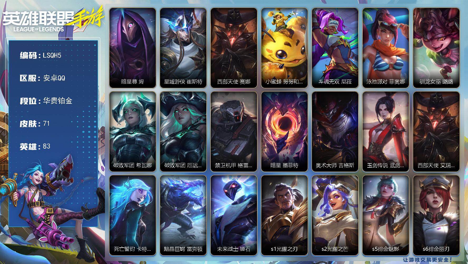 【LSQH5】83英雄/71皮肤/3传说/华贵铂金/暗星尊 烬/星域游侠 崔斯特/西部天使 赛娜/小蜜蜂 努努和威朗普/斗魂无双 尼菈/泳池派对 菲奥娜/驯龙女巫 璐璐/破败军团 希瓦娜/破败军团 厄运小姐/禁卫机甲 格雷福斯/暗星 墨菲特/奥术大师 吉格斯/玉剑传说 武剑仙 锐雯/西部天使 艾瑞莉娅/死亡誓约 卡特琳娜/黯晶巨鳄 雷克顿/未来战士 锤石/s1光耀之刃/s2光耀之芒/s5绯金魅影/s6绯金丽刃/s7绯金战斧/s9王牌舰长/s10王牌上将/s11王牌司令/s12龙冕先锋/s13龙冕御盾/s14龙冕神策/s17冠翎御风使/S19冠翎征服者/海上霸主 盖伦/暗黑武士 雷恩加尔/时之