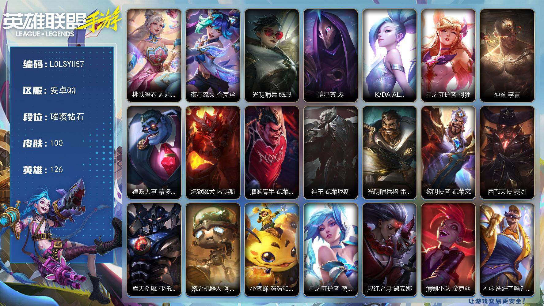 【LOLSYH57】126英雄/100皮肤/2神话/璀璨钻石/桃映暖春 灼灼芳菲 拉克丝/夜星流火 金克丝/光明哨兵 薇恩/暗星尊 烬/K/DA ALL OUT 萨勒芬妮/星之守护者 阿狸/神拳 李青/律政大亨 蒙多医生/炼狱魔犬 内瑟斯/灌篮高手 德莱厄斯/神王 德莱厄斯/光明哨兵 格雷福斯/黎明使者 德莱文/西部天使 赛娜/霸天剑魔 亚托克斯/殇之机器人 阿木木/小蜜蜂 努努和威朗普/星之守护者 奥莉安娜/腥红之月 黛安娜/清剿小队 金克丝/礼物选好了吗? 布隆/东恒之曜 奥瑞利安·索尔/K/DA ALL OUT 伊芙琳/清剿小队 潘森/K/DA ALL OUT 阿卡丽/源计划:暗影 阿