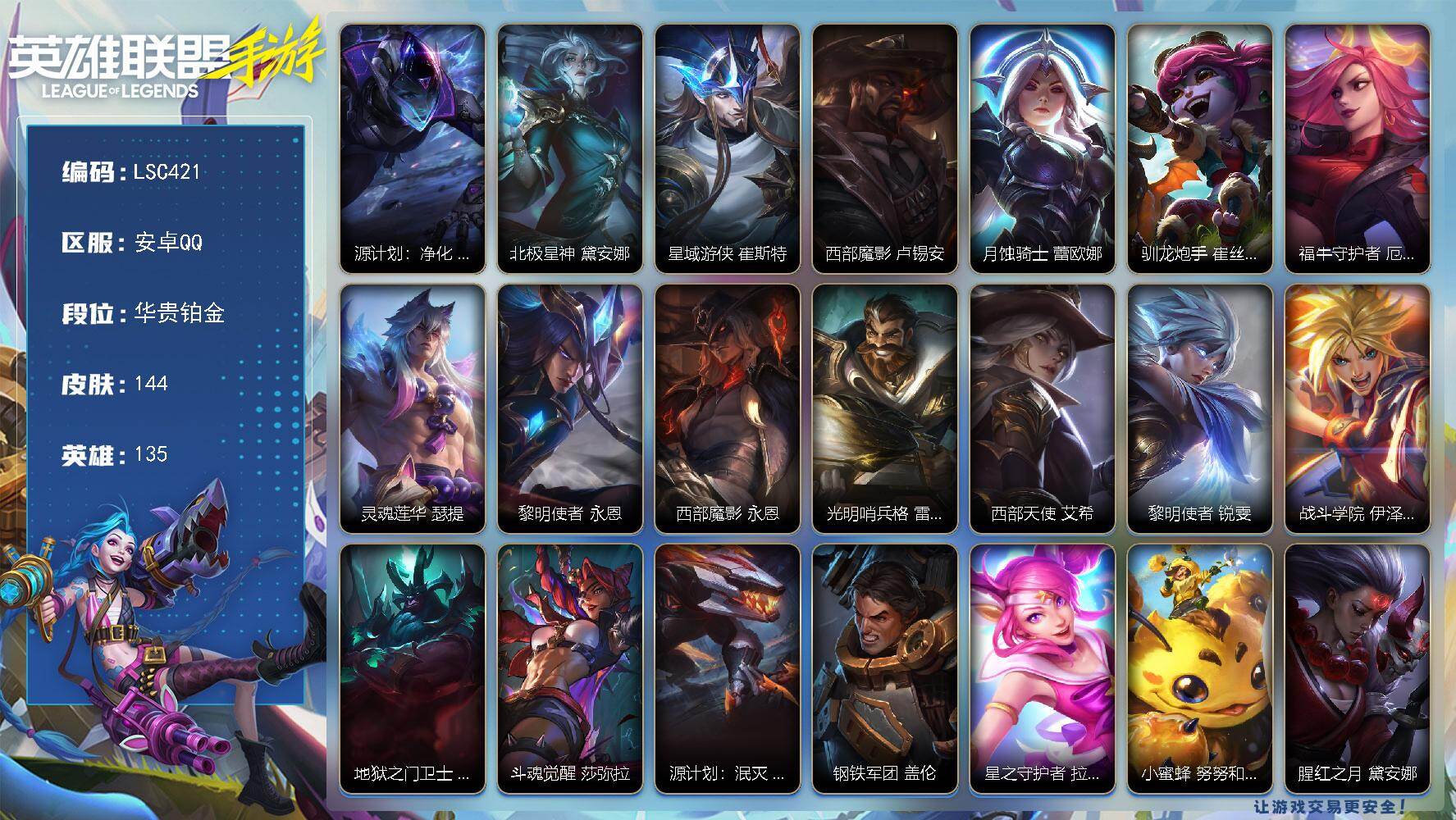 【LSC421】135英雄/144皮肤/17传说/华贵铂金/源计划:净化 薇恩/北极星神 黛安娜/星域游侠 崔斯特/西部魔影 卢锡安/月蚀骑士 蕾欧娜/驯龙炮手 崔丝塔娜/福牛守护者 厄运小姐/灵魂莲华 瑟提/黎明使者 永恩/西部魔影 永恩/光明哨兵 格雷福斯/西部天使 艾希/黎明使者 锐雯/战斗学院 伊泽瑞尔/地狱之门卫士 加里奥/斗魂觉醒 莎弥拉/源计划:泯灭 雷克顿/钢铁军团 盖伦/星之守护者 拉克丝/小蜜蜂 努努和威朗普/腥红之月 黛安娜/光明哨兵 黛安娜/清剿小队 金克丝/战斗校长 悠米/礼物选好了吗? 布隆/西部牛仔 烬/灰烬领主 奥瑞利安·索尔/东恒之曜 奥瑞利安·索尔/弹幕天