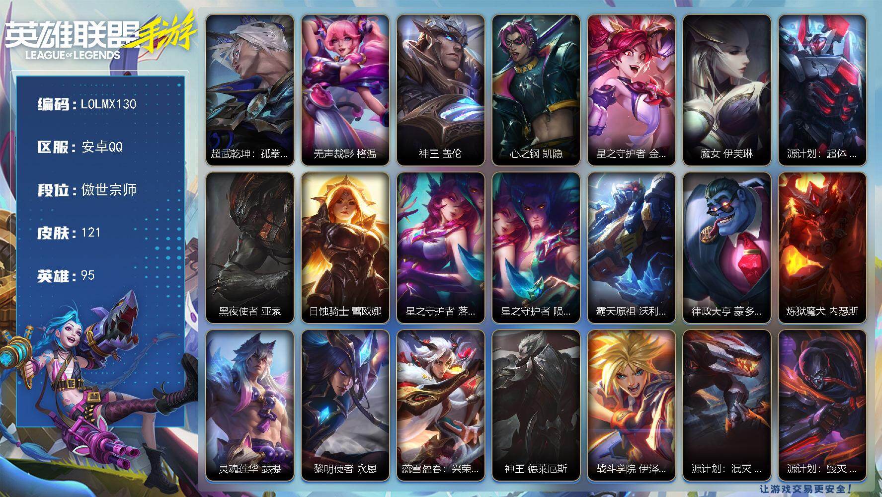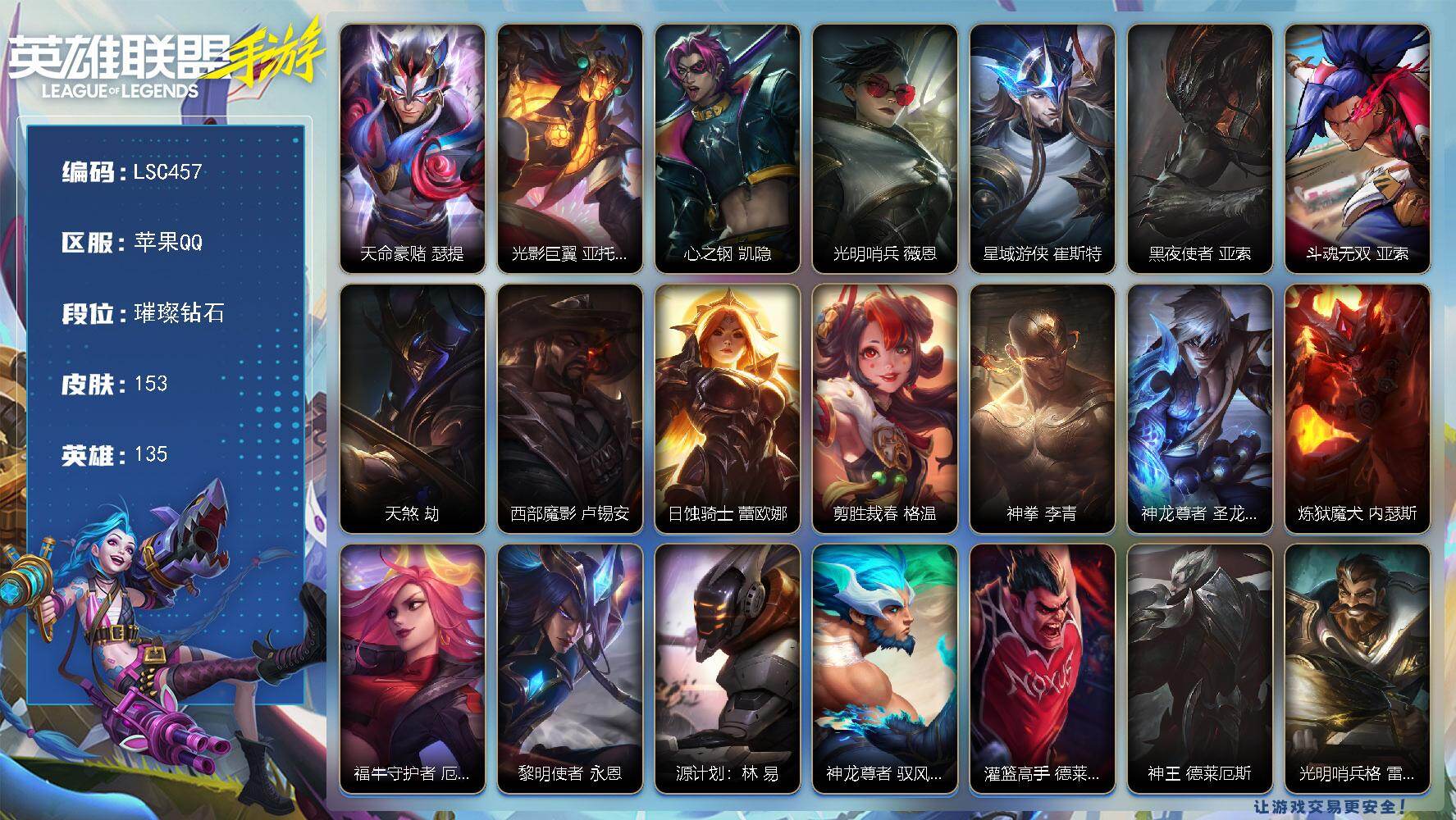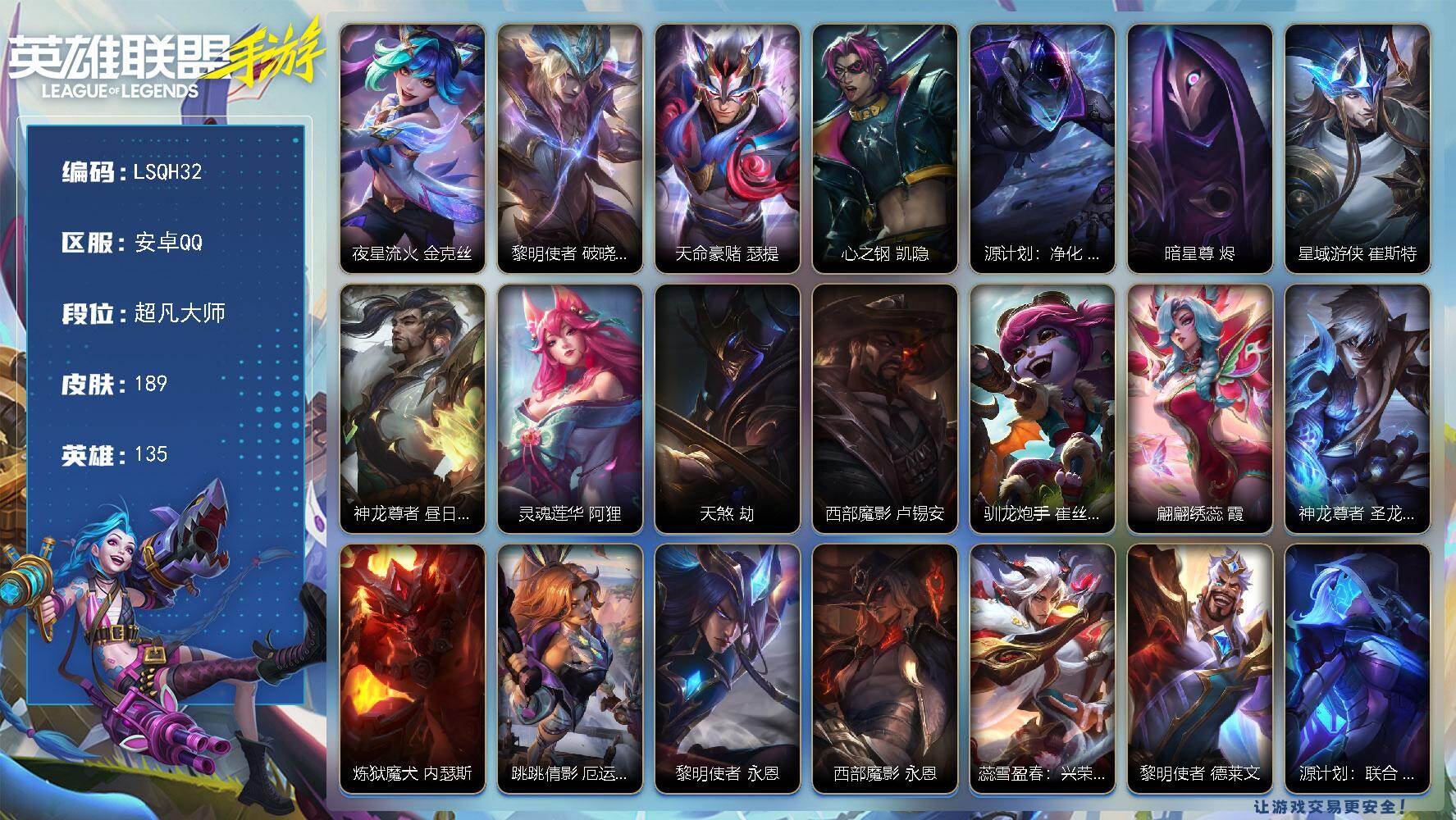 【LSQH32】135英雄/189皮肤/2神话/21传说/97史诗/超凡大师/夜星流火 金克丝/黎明使者 破晓之殇 佛耶戈/天命豪赌 瑟提/心之钢 凯隐/源计划:净化 薇恩/暗星尊 烬/星域游侠 崔斯特/神龙尊者 昼日真龙 亚索/灵魂莲华 阿狸/天煞 劫/西部魔影 卢锡安/驯龙炮手 崔丝塔娜/翩翩绣蕊 霞/神龙尊者 圣龙 李青/炼狱魔犬 内瑟斯/跳跳倩影 厄运小姐/黎明使者 永恩/西部魔影 永恩/蕊雪盈春:兴荣 永恩/黎明使者 德莱文/源计划:联合 艾希/西部天使 艾希/源计划:泯灭 雷克顿/霸天零式 赛恩/钢铁军团 盖伦/惊悚派对 阿木木/殇之机器人 阿木木/地狱火 阿木木/劲道美味 阿木英雄联盟手游 - 安卓QQ -