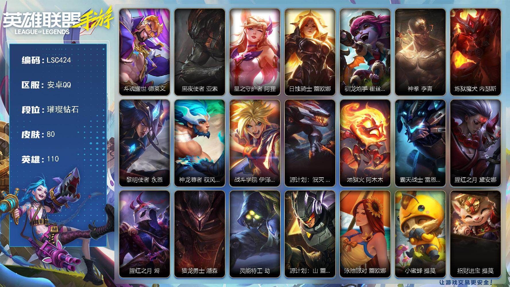 【LSC424】110英雄/80皮肤/璀璨钻石/斗魂耀世 德莱文/黑夜使者 亚索/星之守护者 阿狸/日蚀骑士 蕾欧娜/驯龙炮手 崔丝塔娜/神拳 李青/炼狱魔犬 内瑟斯/黎明使者 永恩/神龙尊者 驭风啸龙 易/战斗学院 伊泽瑞尔/源计划:泯灭 雷克顿/地狱火 阿木木/霸天战士 雷恩加尔/腥红之月 黛安娜/腥红之月 烬/猎龙勇士 潘森/灵能特工 劫/源计划:山 蕾欧娜/泳池派对 蕾欧娜/小蜜蜂 提莫/招财进宝 提莫/电玩女神 娑娜/晨星之翎 洛/源代码 卡蜜尔/暗星 嘉文四世/绝命机甲 格雷福斯/冰川巨兽 墨菲特/银河魔装机神 菲兹/战场之王 吉格斯/星域学者 索拉卡/猎龙勇士 奥拉夫/我,怒角英雄联盟手游 - 安卓QQ -