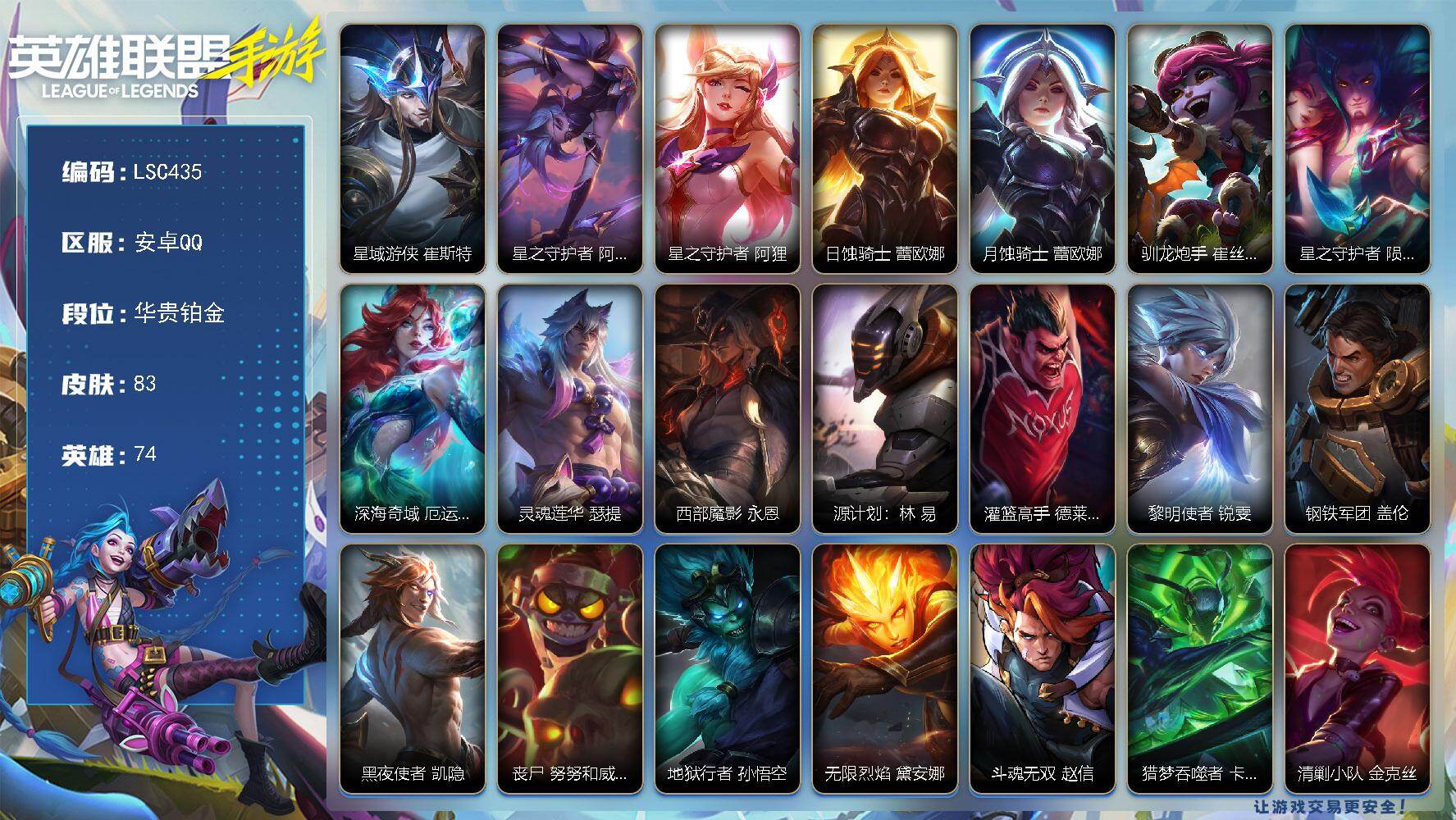 【LSC435】74英雄/83皮肤/华贵铂金/星域游侠 崔斯特/星之守护者 阿卡丽/星之守护者 阿狸/日蚀骑士 蕾欧娜/月蚀骑士 蕾欧娜/驯龙炮手 崔丝塔娜/星之守护者 陨 洛/深海奇域 厄运小姐/灵魂莲华 瑟提/西部魔影 永恩/源计划:林 易/灌篮高手 德莱厄斯/黎明使者 锐雯/钢铁军团 盖伦/黑夜使者 凯隐/丧尸 努努和威朗普/地狱行者 孙悟空/无限烈焰 黛安娜/斗魂无双 赵信/猎梦吞噬者 卡兹克/清剿小队 金克丝/末路管家 布隆/猛虎 布隆/灵魂莲华 辛德拉/猎龙勇士 潘森/源计划:火 菲奥娜/电玩女神 阿狸/死亡誓约 劫/灵能特工 劫/战斗学院 蕾欧娜/我,羽饰骑士 崔丝塔娜/星之守英雄联盟手游 - 安卓QQ -