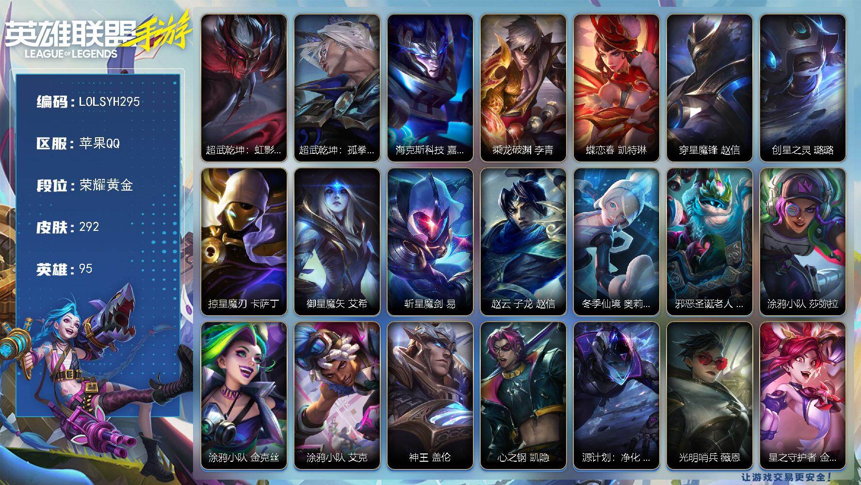 【LOLSYH295】95英雄/292皮肤/荣耀黄金/超武乾坤:虹影 劫/超武乾坤:孤拳 瑟提/海克斯科技 嘉文四世/乘龙破渊 李青/蝶恋春 凯特琳/穿星魔锋 赵信/创星之灵 璐璐/掠星魔刃 卡萨丁/御星魔矢 艾希/斩星魔剑 易/赵云 子龙 赵信/冬季仙境 奥莉安娜/邪恶圣诞老人 维迦/涂鸦小队 莎弥拉/涂鸦小队 金克丝/涂鸦小队 艾克/神王 盖伦/心之钢 凯隐/源计划:净化 薇恩/光明哨兵 薇恩/星之守护者 金克丝/暗星尊 烬/星域游侠 崔斯特/K/DA ALL OUT 萨勒芬妮/黑夜使者 亚索/斗魂无双 亚索/星之守护者 阿狸/天煞 劫/西部魔影 卢锡安/日蚀骑士 蕾欧娜/月蚀骑士 蕾欧