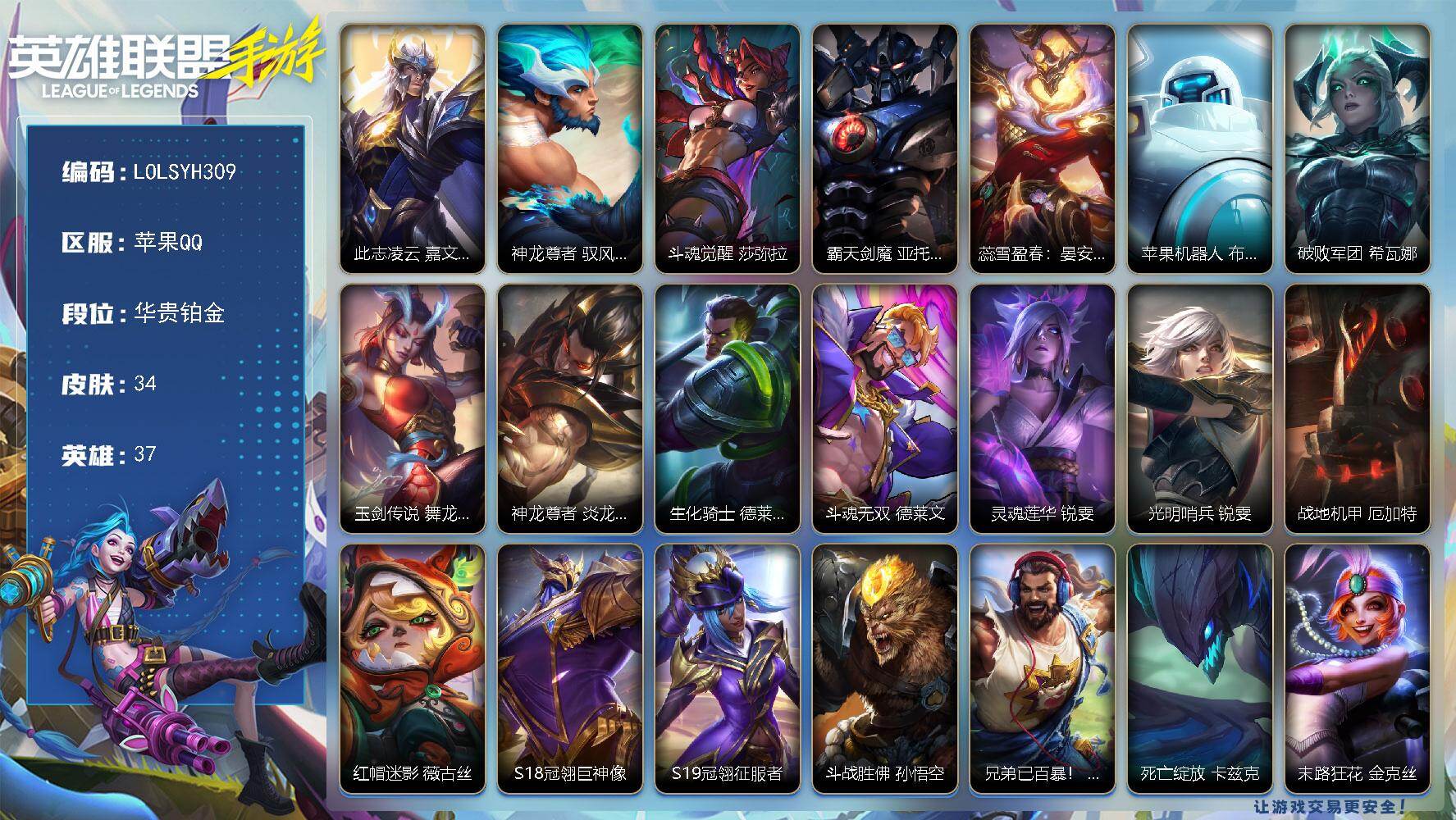 【LOLSYH309】37英雄/34皮肤/1神话/2传说/华贵铂金/此志凌云 嘉文四世/神龙尊者 驭风啸龙 易/斗魂觉醒 莎弥拉/霸天剑魔 亚托克斯/蕊雪盈春:晏安 赫卡里姆/苹果机器人 布里茨/破败军团 希瓦娜/玉剑传说 舞龙卫 希瓦娜/神龙尊者 炎龙 瑟提/生化骑士 德莱厄斯/斗魂无双 德莱文/灵魂莲华 锐雯/光明哨兵 锐雯/战地机甲 厄加特/红帽迷影 薇古丝/S18冠翎巨神像/S19冠翎征服者/斗战胜佛 孙悟空/兄弟已百暴! 泰达米尔/死亡绽放 卡兹克/末路狂花 金克丝/冠翎征服者 尼菈/“你看见过我的熊猫吗?” 安妮/西部牛仔 亚索/末世天使 凯尔/声威黠影 提莫/黯黑魔龙 希瓦娜/
