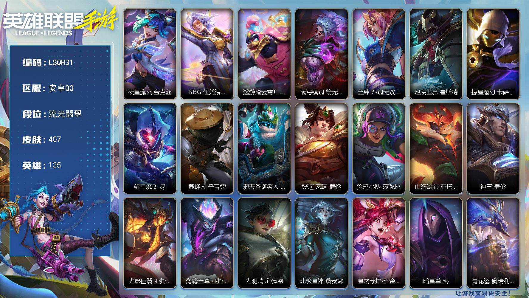 【LSQH31】135英雄/407皮肤/6神话/45传说/211史诗/流光翡翠/夜星流火 金克丝/KBG 任凭浪起 破浪 菲奥娜/巡游踏云霄! 墨菲特/满弓镇魂 箭无虚发 韦鲁斯/至臻 斗魂无双 艾瑞莉娅/地底世界 崔斯特/掠星魔刃 卡萨丁/斩星魔剑 易/养蜂人 辛吉德/邪恶圣诞老人 维迦/张辽 文远 盖伦/涂鸦小队 莎弥拉/山海绘卷 亚托克斯/神王 盖伦/光影巨翼 亚托克斯/海魔至尊 亚托克斯/光明哨兵 薇恩/北极星神 黛安娜/星之守护者 金克丝/暗星尊 烬/青花瓷 奥瑞利安·索尔/春晖神裔 辛德拉/星域游侠 崔斯特/春晖神女 莫甘娜/星之守护者 阿卡丽/幻灵特战队长 菲奥娜/黑夜使者 亚