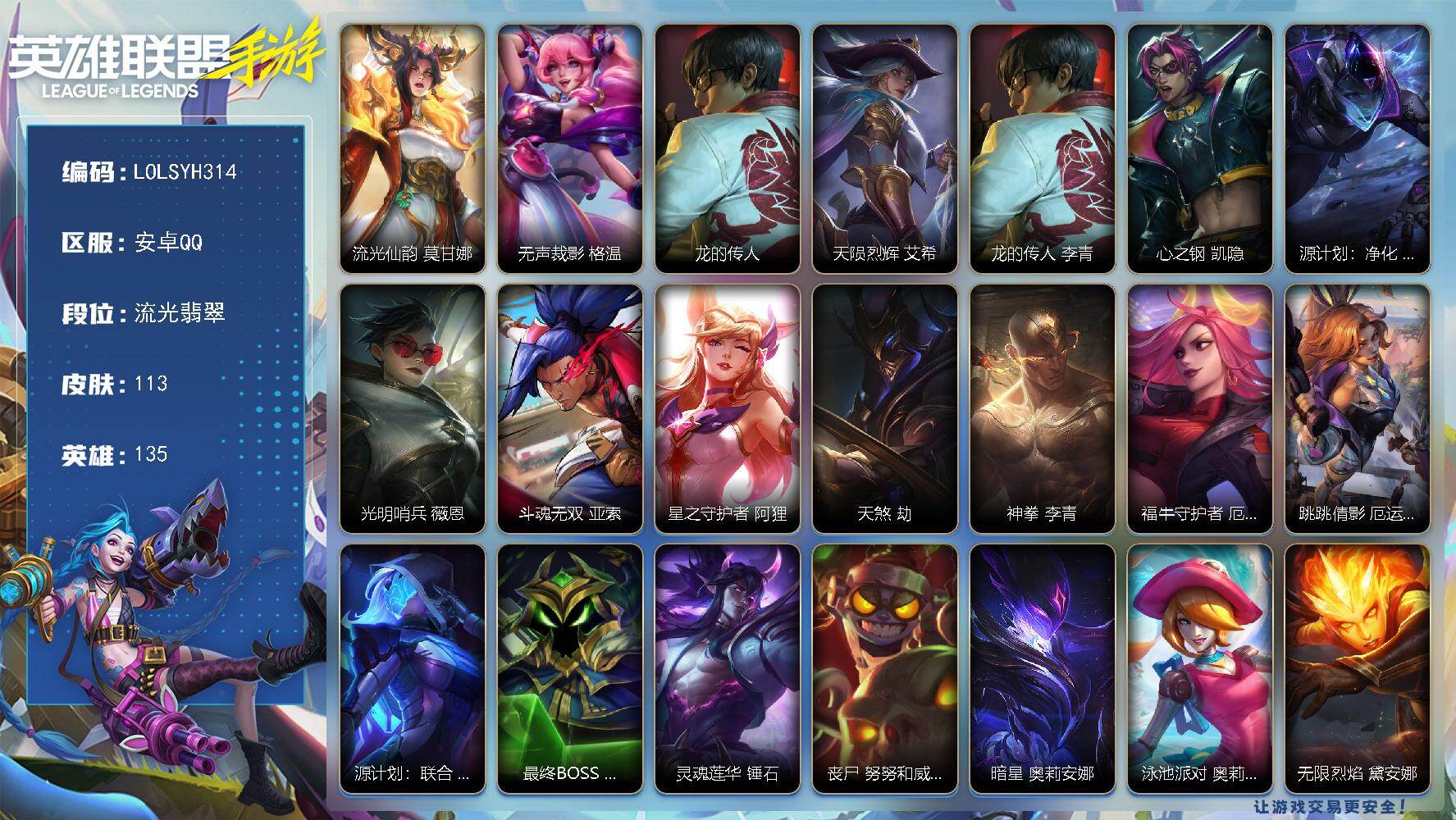 【LOLSYH314】135英雄/113皮肤/4神话/12传说/流光翡翠/流光仙韵 莫甘娜/无声裁影 格温/龙的传人 李青/天陨烈辉 艾希/心之钢 凯隐/源计划:净化 薇恩/光明哨兵 薇恩/斗魂无双 亚索/星之守护者 阿狸/天煞 劫/神拳 李青/福牛守护者 厄运小姐/跳跳倩影 厄运小姐/源计划:联合 艾希/最终BOSS 维迦/灵魂莲华 锤石/丧尸 努努和威朗普/暗星 奥莉安娜/泳池派对 奥莉安娜/无限烈焰 黛安娜/恶魔之刃 泰达米尔/猎龙勇士 赵信/清剿小队 金克丝/蕊雪盈春:晏安 赫卡里姆/礼物选好了吗? 布隆/腥红之月 烬/K/DA ALL OUT 卡莎/K/DA ALL OUT 阿卡丽