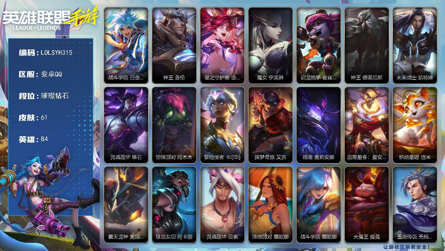 【LOLSYH315】84英雄/61皮肤/璀璨钻石/战斗学院 白金学长 伊泽瑞尔/神王 盖伦/星之守护者 金克丝/魔女 伊芙琳/驯龙炮手 崔丝塔娜/神王 德莱厄斯/未来战士 凯特琳/灵魂莲华 锤石/惊悚派对 阿木木/黎明使者 卡尔玛/探梦奇旅 艾克/暗星 奥莉安娜/蕊雪盈春:晏安 赫卡里姆/烘焙童谣 悠米/霸天龙神 奥瑞利安·索尔/铁血女忍 阿卡丽/灵魂莲华 亚索/泳池派对 蕾欧娜/战斗学院 蕾欧娜/大魔王 提莫/玉剑传说 无极 易/猫狗大战 千珏/斗魂无双 德莱文/银河魔装机神 菲兹/绒毛 菲兹/未来战士 慎/灵魂烈焰 布兰德/真实伤害 赛娜/星之守护者 赛娜/s1光耀之刃/s5绯金魅影/英雄联盟手游 - 安卓QQ -