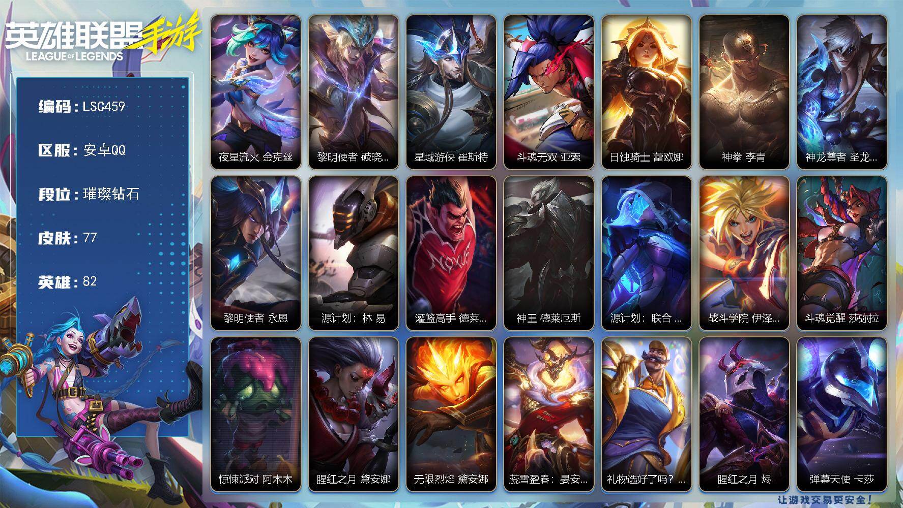 【LSC459】82英雄/77皮肤/1神话/12传说/23史诗/璀璨钻石/夜星流火 金克丝/黎明使者 破晓之殇 佛耶戈/星域游侠 崔斯特/斗魂无双 亚索/日蚀骑士 蕾欧娜/神拳 李青/神龙尊者 圣龙 李青/黎明使者 永恩/源计划:林 易/灌篮高手 德莱厄斯/神王 德莱厄斯/源计划:联合 艾希/战斗学院 伊泽瑞尔/斗魂觉醒 莎弥拉/惊悚派对 阿木木/腥红之月 黛安娜/无限烈焰 黛安娜/蕊雪盈春:晏安 赫卡里姆/礼物选好了吗? 布隆/腥红之月 烬/弹幕天使 卡莎/电玩女神 卡莎/未来战士 菲奥娜/死亡誓约 劫/玉剑传说 无劫 劫/我,羽饰骑士 崔丝塔娜/驯龙女巫 璐璐/玉剑传说 舞龙卫 希瓦娜/英雄联盟手游 - 安卓QQ -