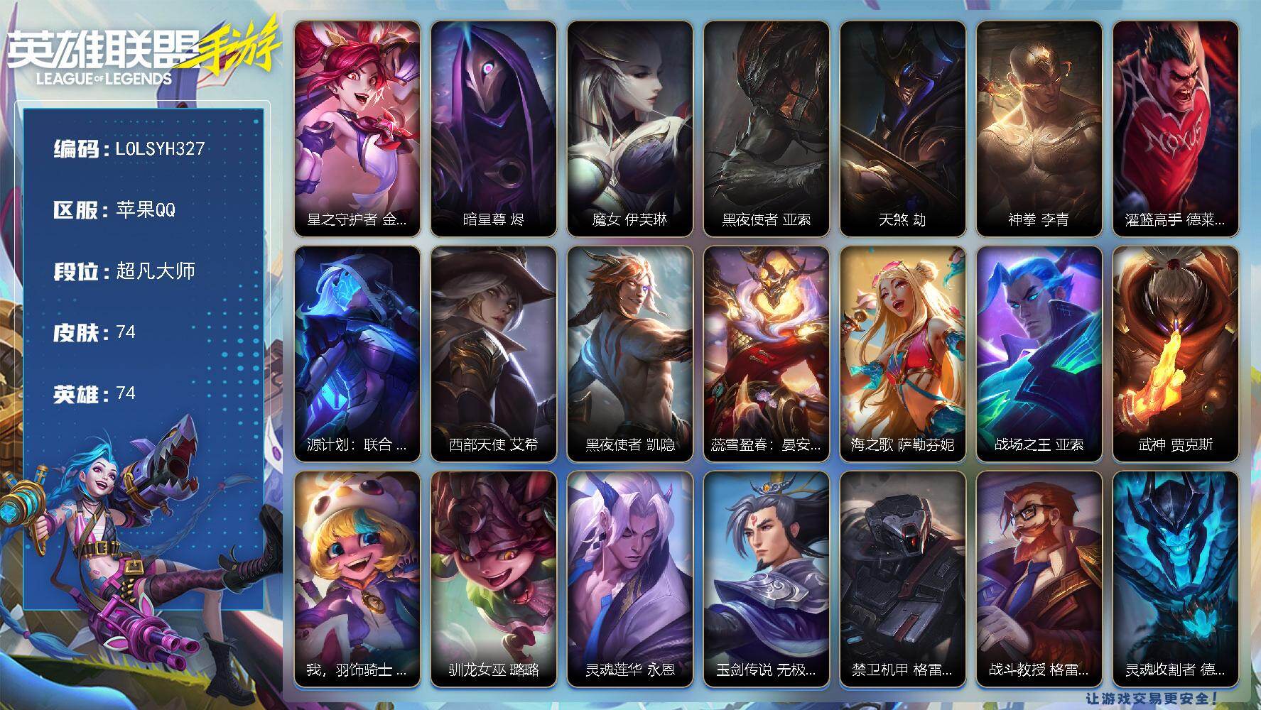 【LOLSYH327】74英雄/74皮肤/超凡大师/星之守护者 金克丝/暗星尊 烬/魔女 伊芙琳/黑夜使者 亚索/天煞 劫/神拳 李青/灌篮高手 德莱厄斯/源计划:联合 艾希/西部天使 艾希/黑夜使者 凯隐/蕊雪盈春:晏安 赫卡里姆/海之歌 萨勒芬妮/战场之王 亚索/武神 贾克斯/我,羽饰骑士 崔丝塔娜/驯龙女巫 璐璐/灵魂莲华 永恩/玉剑传说 无极 易/禁卫机甲 格雷福斯/战斗教授 格雷福斯/灵魂收割者 德莱文/暗星 墨菲特/天启骑士 杰斯/抵抗军雷神 杰斯/猎龙勇士 奥拉夫/宇航员 诺提勒斯/s2光耀之芒/s5绯金魅影/s6绯金丽刃/s7绯金战斧/s10王牌上将/s11王牌司令/s12龙英雄联盟手游 - 苹果QQ -