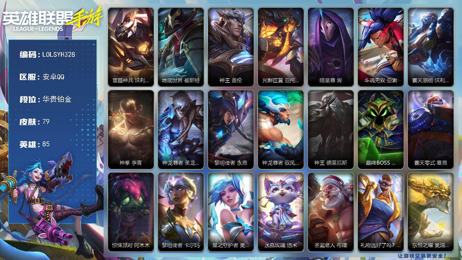 【LOLSYH328】85英雄/79皮肤/1神话/12传说/华贵铂金/雷霆神兵 沃利贝尔/地底世界 崔斯特/神王 盖伦/光影巨翼 亚托克斯/暗星尊 烬/斗魂无双 亚索/霸天原祖 沃利贝尔/神拳 李青/神龙尊者 圣龙 李青/黎明使者 永恩/神龙尊者 驭风啸龙 易/神王 德莱厄斯/最终BOSS 维迦/霸天零式 赛恩/惊悚派对 阿木木/黎明使者 卡尔玛/星之守护者 奥莉安娜/水晶玫瑰 悠米/圣诞老人 布隆/礼物选好了吗? 布隆/东恒之曜 奥瑞利安·索尔/电玩女神 卡莎/西宙之晖 潘森/K/DA ALL OUT 阿卡丽/福牛守护者 安妮/源计划:阴 劫/屠龙勇士 凯尔/小蜜蜂 提莫/炼狱魔女 蔚/西英雄联盟手游 - 安卓QQ -