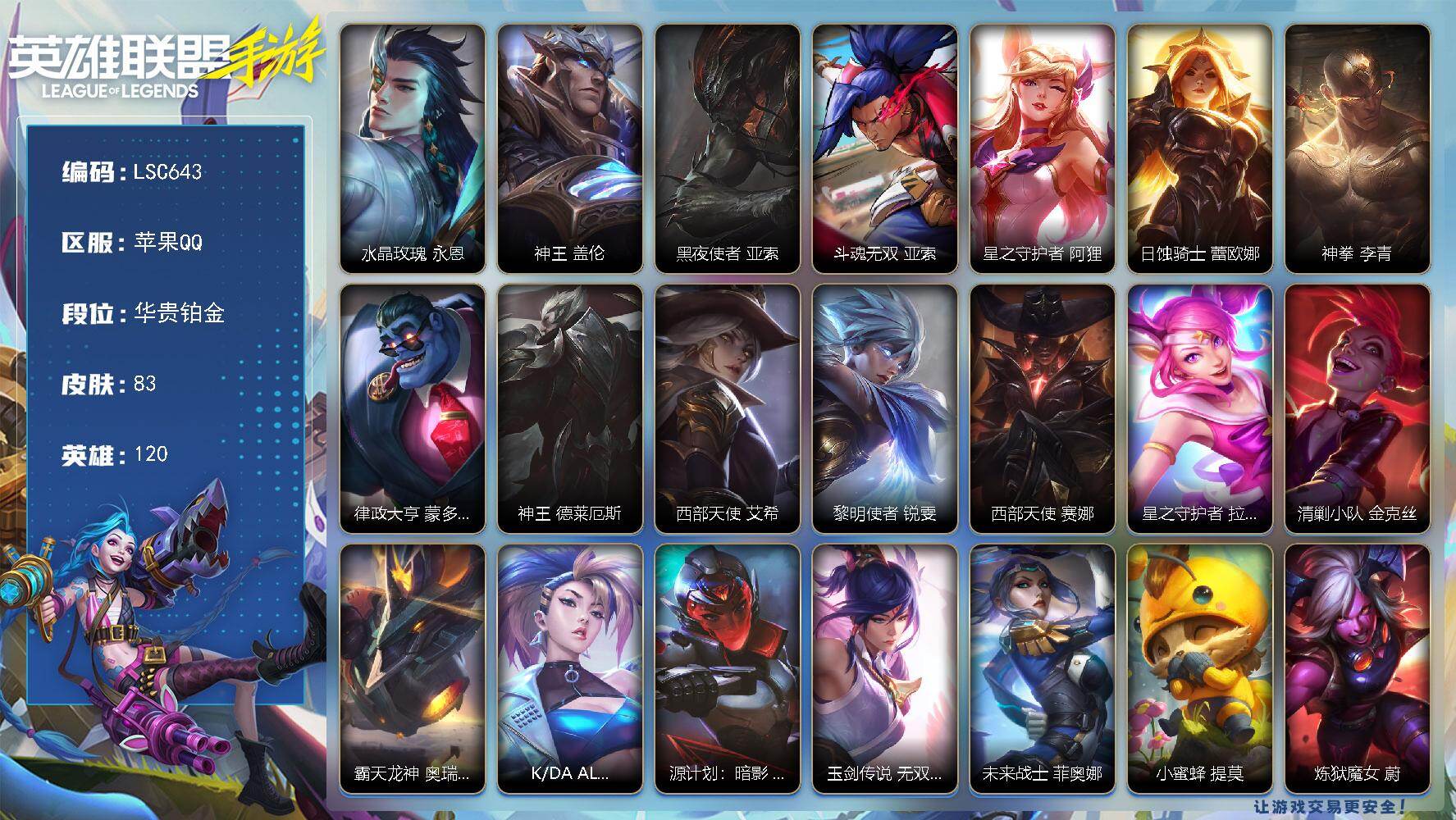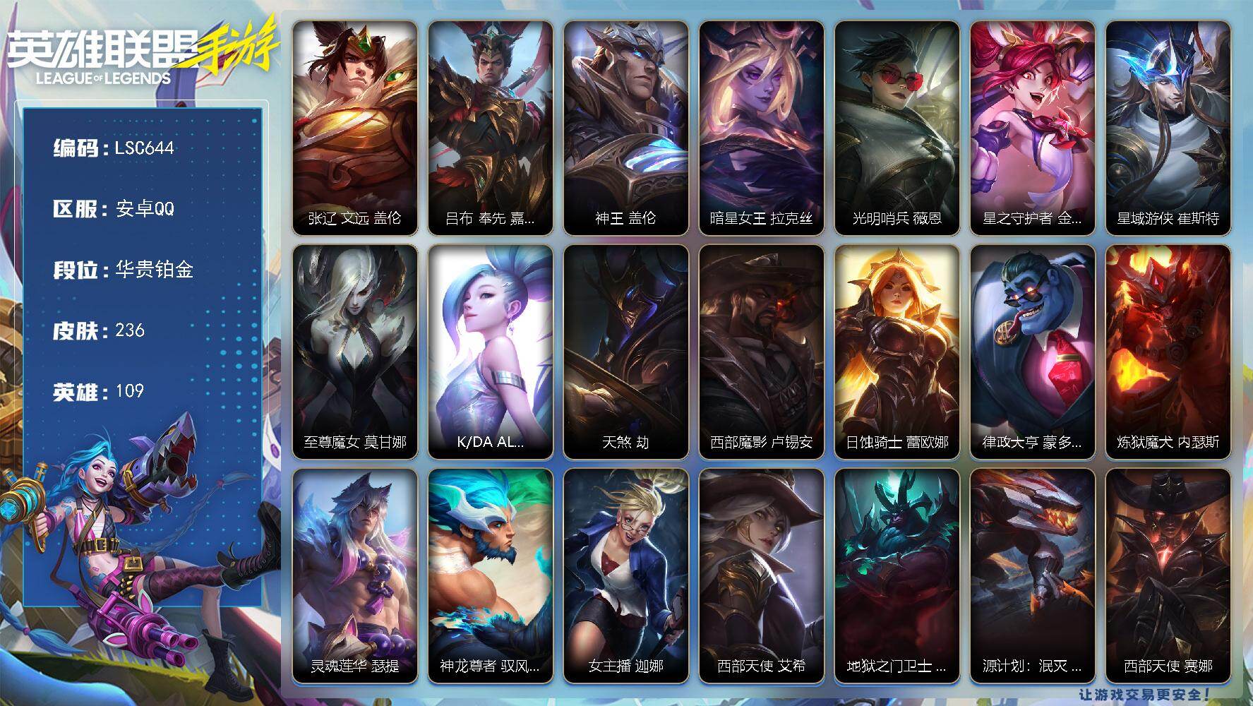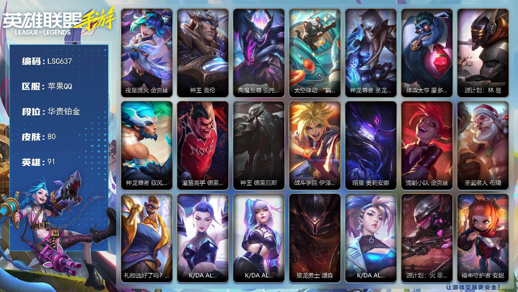 【LSC629】90英雄/89皮肤/华贵铂金/银鞍玉甲 嘉文四世/神龙烈焰 金克丝/涂鸦小队 金克丝/源计划:净化 薇恩/星之守护者 金克丝/暗星尊 烬/星域游侠 崔斯特/星之守护者 卡莎/K/DA ALL OUT 萨勒芬妮/黑夜使者 亚索/星之守护者 阿狸/天煞 劫/西部魔影 卢锡安/驯龙炮手 崔丝塔娜/星之守护者 辉 霞/星之守护者 落 霞/星之守护者 陨 洛/星之守护者 熠 洛/跳跳倩影 厄运小姐/灌篮高手 德莱厄斯/源计划:联合 艾希/战斗学院 伊泽瑞尔/西部天使 赛娜/灵魂莲华 锤石/钢铁军团 盖伦/睡衣守护者 拉克丝/地狱火 阿木木/清剿小队 金克丝/K/DA ALL OUT 阿英雄联盟手游 - 安卓QQ -