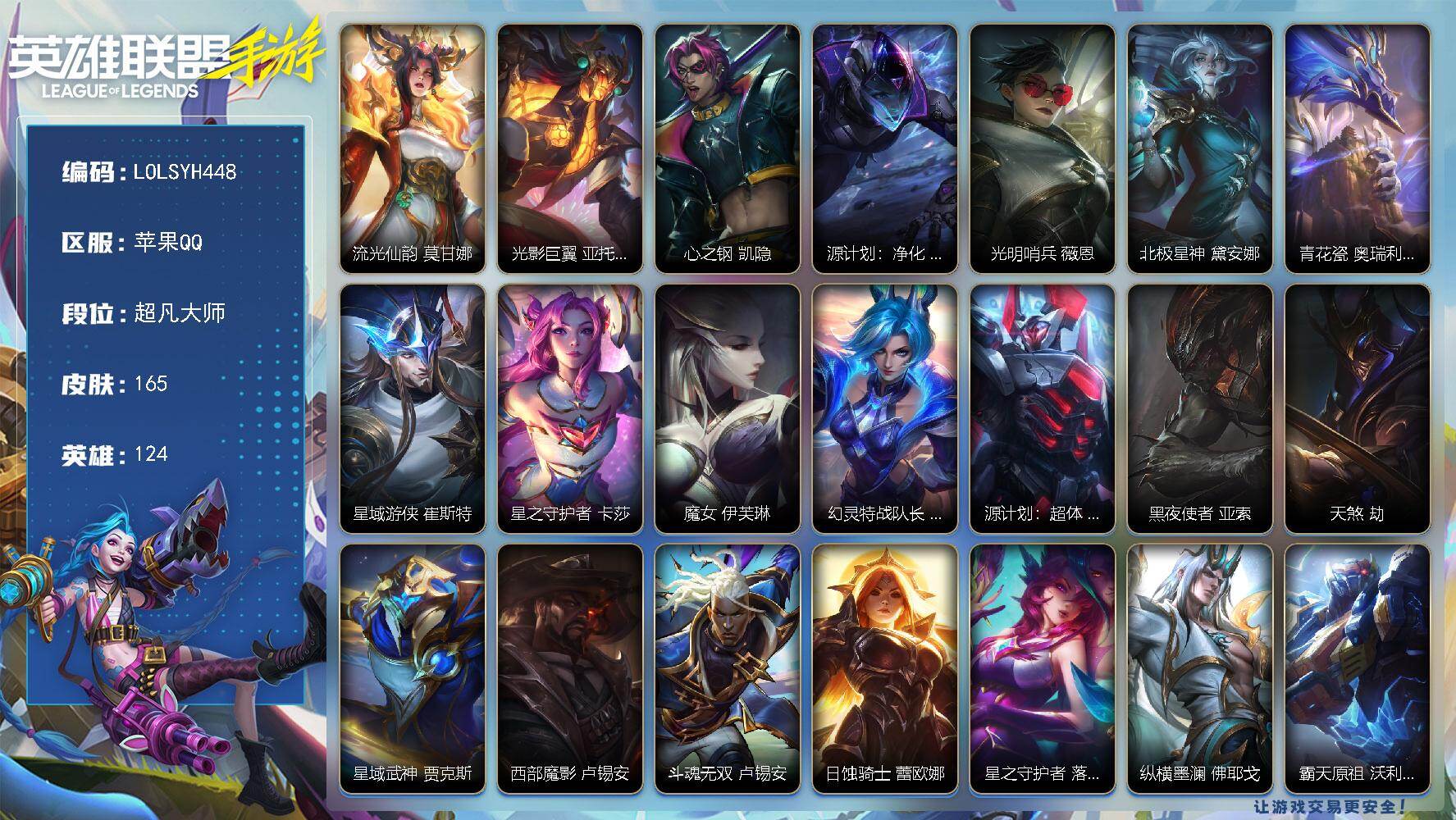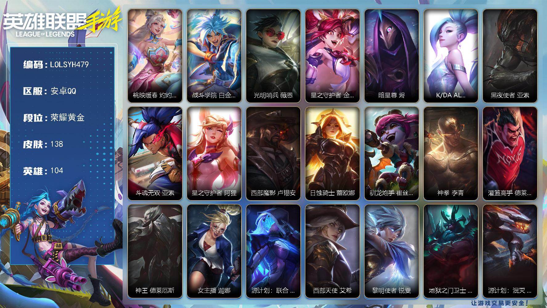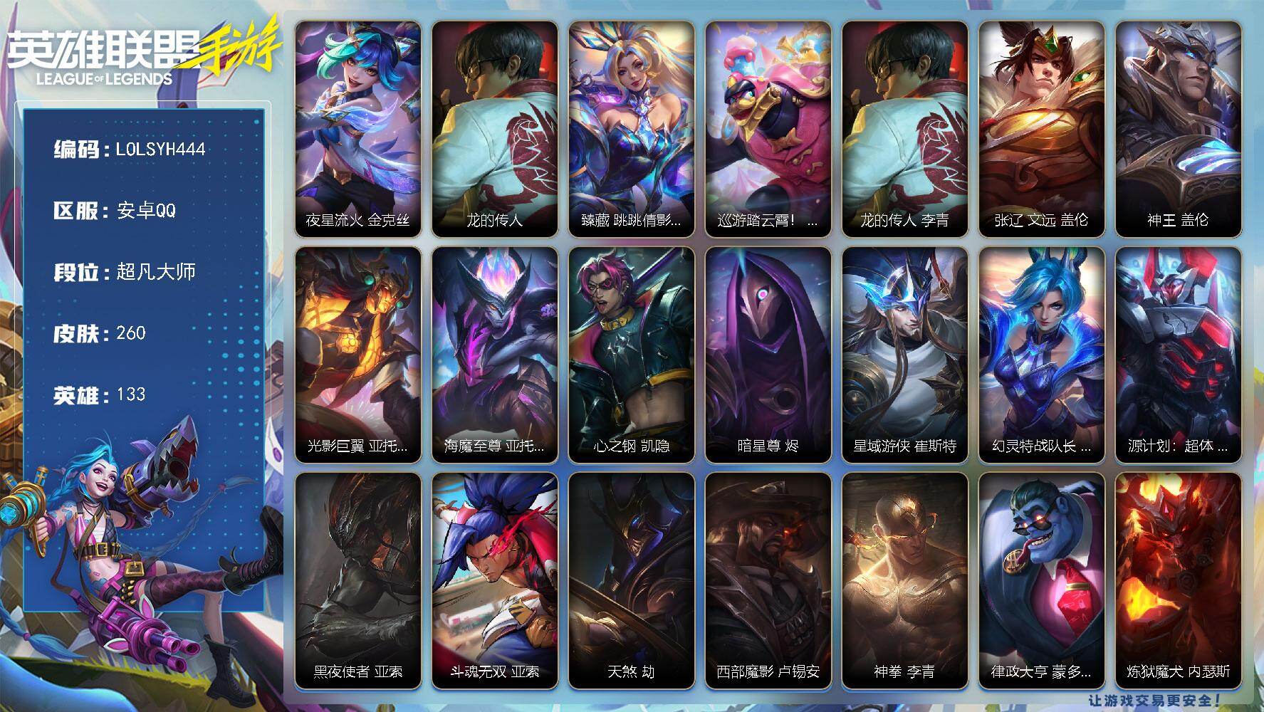 【LSC629】90英雄/89皮肤/华贵铂金/银鞍玉甲 嘉文四世/神龙烈焰 金克丝/涂鸦小队 金克丝/源计划:净化 薇恩/星之守护者 金克丝/暗星尊 烬/星域游侠 崔斯特/星之守护者 卡莎/K/DA ALL OUT 萨勒芬妮/黑夜使者 亚索/星之守护者 阿狸/天煞 劫/西部魔影 卢锡安/驯龙炮手 崔丝塔娜/星之守护者 辉 霞/星之守护者 落 霞/星之守护者 陨 洛/星之守护者 熠 洛/跳跳倩影 厄运小姐/灌篮高手 德莱厄斯/源计划:联合 艾希/战斗学院 伊泽瑞尔/西部天使 赛娜/灵魂莲华 锤石/钢铁军团 盖伦/睡衣守护者 拉克丝/地狱火 阿木木/清剿小队 金克丝/K/DA ALL OUT 阿英雄联盟手游 - 安卓QQ -