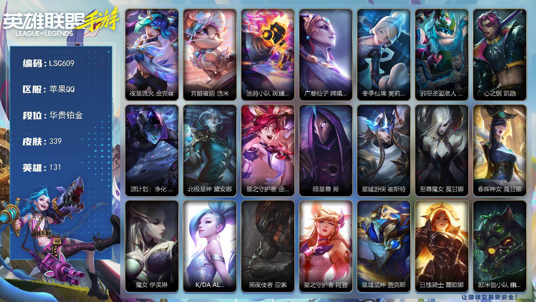 【LSC609】131英雄/339皮肤/3神话/30传说/177史诗/华贵铂金/夜星流火 金克丝/芳醇蜜韵 悠米/涂鸦小队 斑斓艺术 布兰德/广寒仙子 嫦娥 黛安娜/冬季仙境 奥莉安娜/邪恶圣诞老人 维迦/心之钢 凯隐/源计划:净化 薇恩/北极星神 黛安娜/星之守护者 金克丝/暗星尊 烬/星域游侠 崔斯特/至尊魔女 莫甘娜/春晖神女 莫甘娜/魔女 伊芙琳/K/DA ALL OUT 萨勒芬妮/黑夜使者 亚索/星之守护者 阿狸/星域武神 贾克斯/日蚀骑士 蕾欧娜/欧米伽小队 幽灵特工 提莫/星之守护者 陨 洛/剪胜裁春 格温/神拳 李青/福牛守护者 厄运小姐/灵魂莲华 瑟提/黎明使者 永恩/灌篮