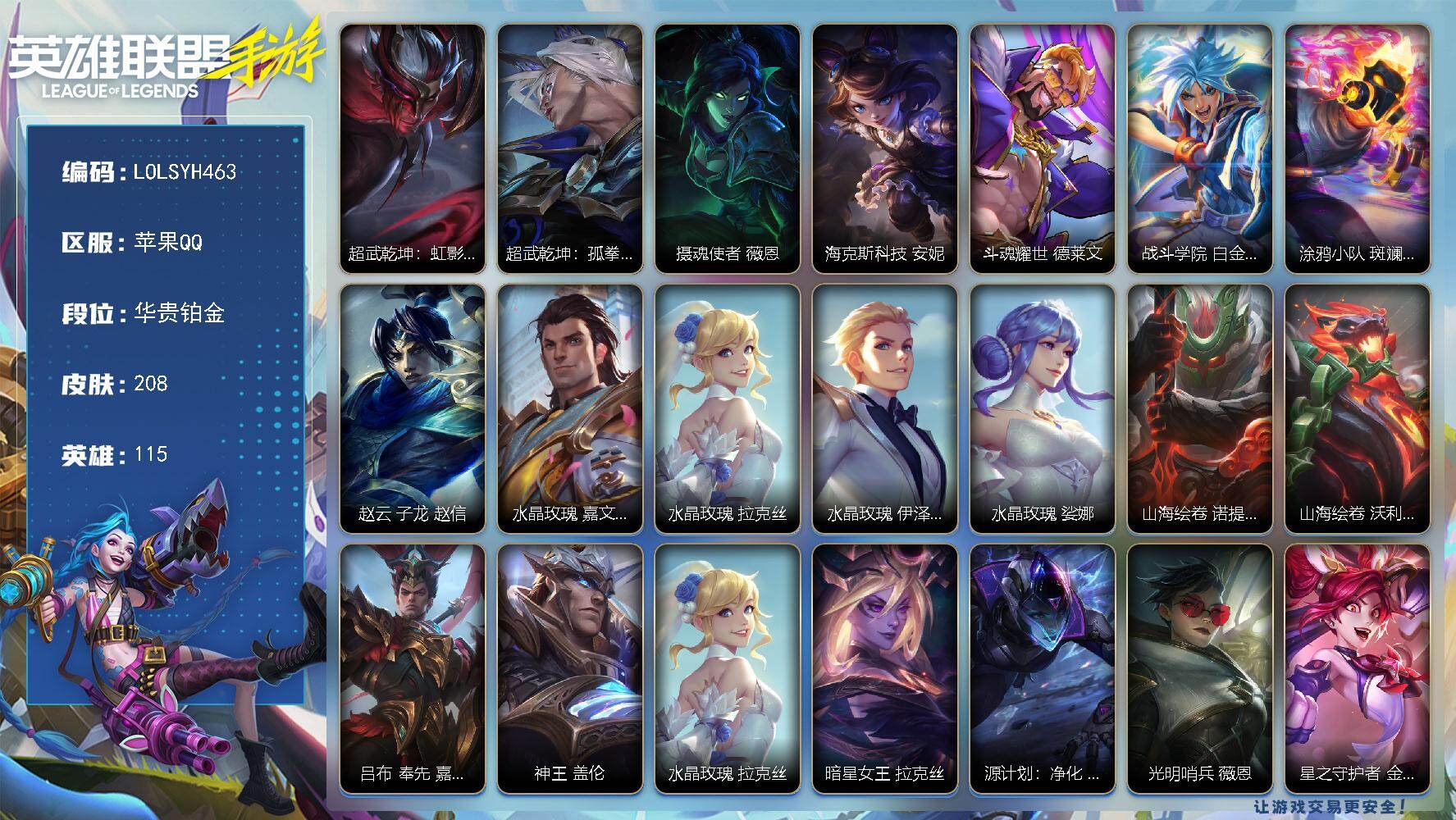 【LOLSYH463】115英雄/208皮肤/华贵铂金/超武乾坤:虹影 劫/超武乾坤:孤拳 瑟提/摄魂使者 薇恩/海克斯科技 安妮/斗魂耀世 德莱文/战斗学院 白金学长 伊泽瑞尔/涂鸦小队 斑斓艺术 布兰德/赵云 子龙 赵信/水晶玫瑰 嘉文四世/水晶玫瑰 拉克丝/水晶玫瑰 伊泽瑞尔/水晶玫瑰 娑娜/山海绘卷 诺提勒斯/山海绘卷 沃利贝尔/吕布 奉先 嘉文四世/神王 盖伦/暗星女王 拉克丝/源计划:净化 薇恩/光明哨兵 薇恩/星之守护者 金克丝/暗星尊 烬/星域游侠 崔斯特/太空律动 “猫猫”布里和里茨 布里茨/K/DA ALL OUT 萨勒芬妮/斗魂无双 亚索/星之守护者 阿狸/日蚀骑士 蕾