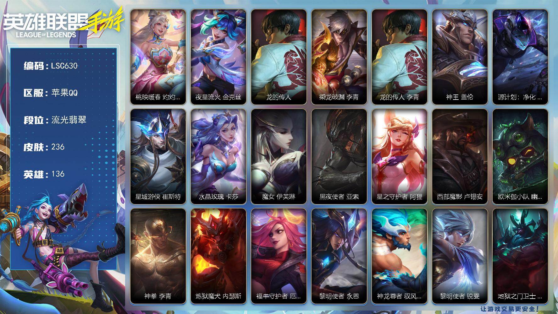 【LSC630】136英雄/236皮肤/流光翡翠/桃映暖春 灼灼芳菲 拉克丝/夜星流火 金克丝/龙的传人 李青/乘龙破渊 李青/神王 盖伦/源计划:净化 薇恩/星域游侠 崔斯特/水晶玫瑰 卡莎/魔女 伊芙琳/黑夜使者 亚索/星之守护者 阿狸/西部魔影 卢锡安/欧米伽小队 幽灵特工 提莫/神拳 李青/炼狱魔犬 内瑟斯/福牛守护者 厄运小姐/黎明使者 永恩/神龙尊者 驭风啸龙 易/黎明使者 锐雯/地狱之门卫士 加里奥/最终BOSS 维迦/西部天使 赛娜/钢铁军团 盖伦/星之守护者 拉克丝/地狱火 阿木木/劲道美味 阿木木/霸天战士 雷恩加尔/黎明使者 卡尔玛/腥红之月 黛安娜/猎龙勇士 赵信/霸