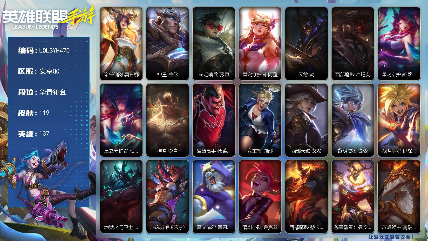 【LOLSYH470】137英雄/119皮肤/1神话/15传说/华贵铂金/流光仙韵 莫甘娜/神王 盖伦/光明哨兵 薇恩/星之守护者 阿狸/天煞 劫/西部魔影 卢锡安/星之守护者 落 霞/星之守护者 陨 洛/神拳 李青/灌篮高手 德莱厄斯/女主播 迦娜/西部天使 艾希/黎明使者 锐雯/战斗学院 伊泽瑞尔/地狱之门卫士 加里奥/斗魂觉醒 莎弥拉/雷喵喵尔 雷恩加尔/清剿小队 金克丝/西部魔影 赫卡里姆/蕊雪盈春:晏安 赫卡里姆/灰烬领主 奥瑞利安·索尔/圣龙 奥瑞利安·索尔/东恒之曜 奥瑞利安·索尔/未来战士 崔斯特/源计划:火 菲奥娜/星之守护者 萨勒芬妮/死亡誓约 劫/欧米伽小队 魔鬼伞兵