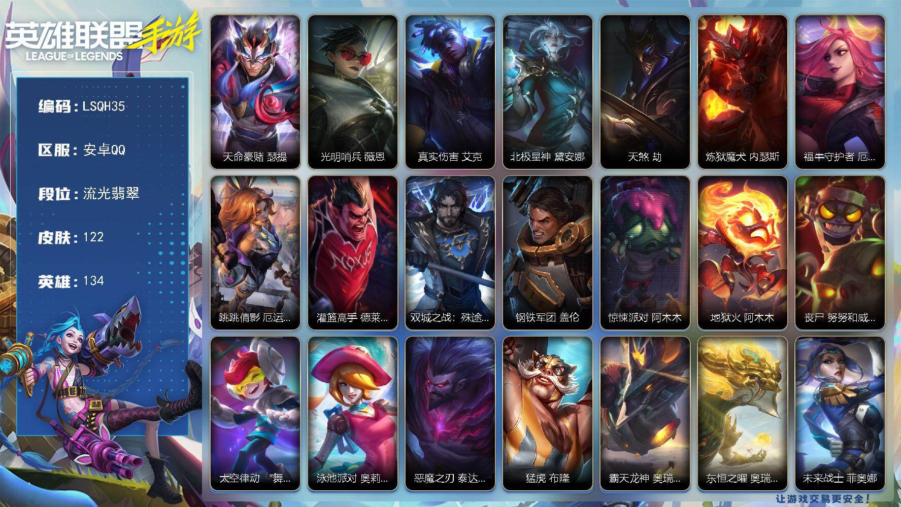 【LSQH35】134英雄/122皮肤/流光翡翠/天命豪赌 瑟提/光明哨兵 薇恩/真实伤害 艾克/北极星神 黛安娜/天煞 劫/炼狱魔犬 内瑟斯/福牛守护者 厄运小姐/跳跳倩影 厄运小姐/灌篮高手 德莱厄斯/双城之战:殊途 杰斯/钢铁军团 盖伦/惊悚派对 阿木木/地狱火 阿木木/丧尸 努努和威朗普/太空律动 “舞林双子” 努努和威朗普/泳池派对 奥莉安娜/恶魔之刃 泰达米尔/猛虎 布隆/霸天龙神 奥瑞利安·索尔/东恒之曜 奥瑞利安·索尔/未来战士 菲奥娜/福牛守护者 菲奥娜/福牛守护者 安妮/灵能特工 劫/我,羽饰骑士 崔丝塔娜/小蜜蜂 提莫/源计划:裁决 蔚/炼狱魔女 蔚/咖啡甜心 格温/魔