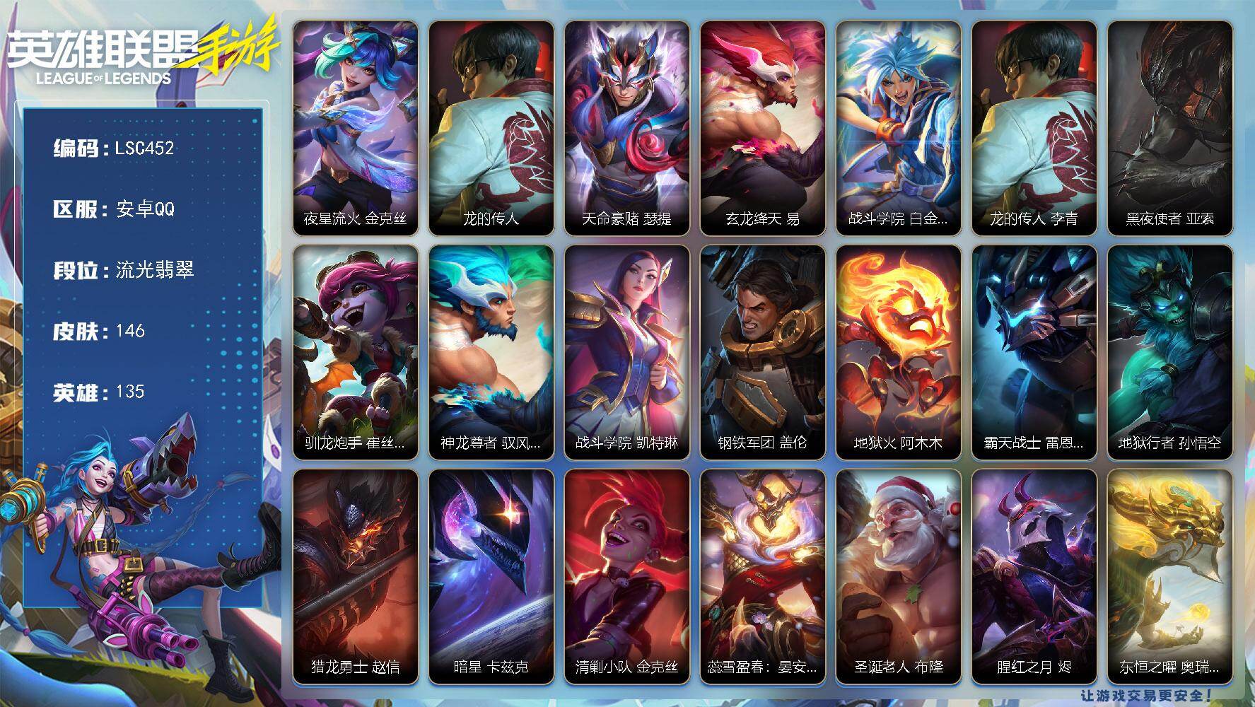 【LSC452】135英雄/146皮肤/流光翡翠/夜星流火 金克丝/龙的传人 李青/天命豪赌 瑟提/玄龙绛天 易/战斗学院 白金学长 伊泽瑞尔/黑夜使者 亚索/驯龙炮手 崔丝塔娜/神龙尊者 驭风啸龙 易/战斗学院 凯特琳/钢铁军团 盖伦/地狱火 阿木木/霸天战士 雷恩加尔/地狱行者 孙悟空/猎龙勇士 赵信/暗星 卡兹克/清剿小队 金克丝/蕊雪盈春:晏安 赫卡里姆/圣诞老人 布隆/腥红之月 烬/东恒之曜 奥瑞利安·索尔/腥红之月 崔斯特/K/DA ALL OUT 卡莎/斗魂无双 尼菈/魅惑女巫 莫甘娜/玉剑传说 苍鸾 莫甘娜/清剿小队 潘森/玉剑传说 无双 菲奥娜/海之歌 萨勒芬妮/福牛守护者英雄联盟手游 - 安卓QQ -