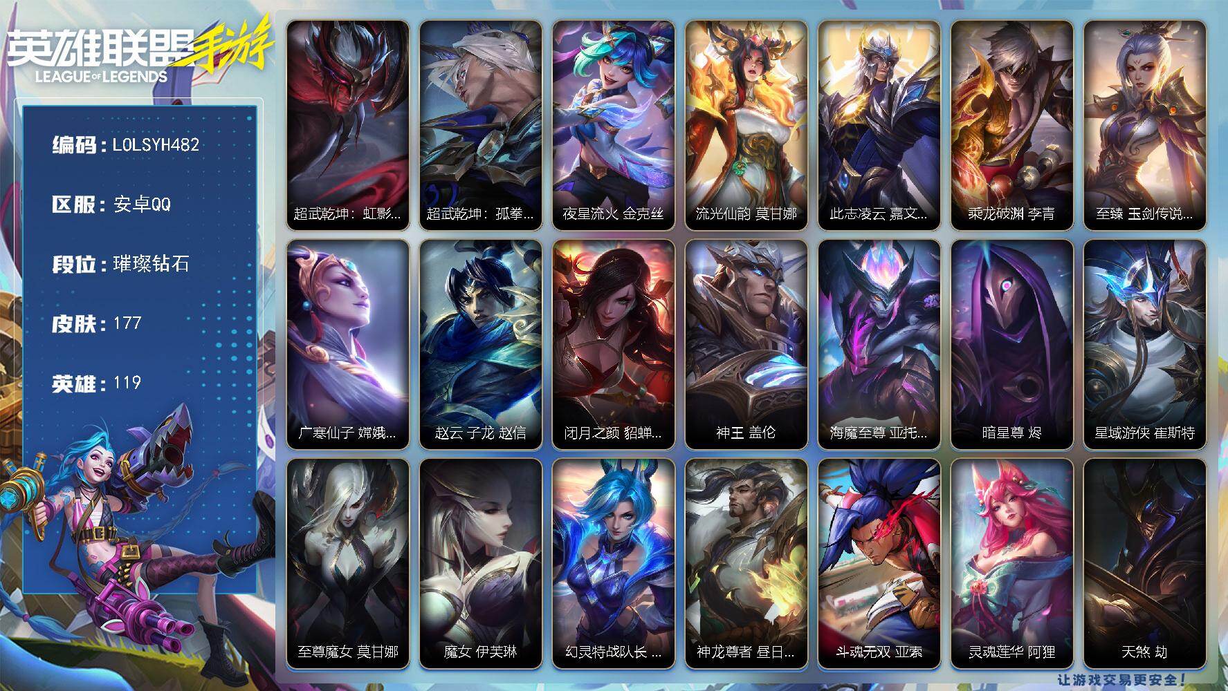 【LOLSYH482】119英雄/177皮肤/2典藏/7神话/30传说/璀璨钻石/超武乾坤:虹影 劫/超武乾坤:孤拳 瑟提/夜星流火 金克丝/流光仙韵 莫甘娜/此志凌云 嘉文四世/乘龙破渊 李青/至臻 玉剑传说 武剑仙 锐雯/广寒仙子 嫦娥 黛安娜/赵云 子龙 赵信/闭月之颜 貂蝉 卡特琳娜/神王 盖伦/海魔至尊 亚托克斯/暗星尊 烬/星域游侠 崔斯特/至尊魔女 莫甘娜/魔女 伊芙琳/幻灵特战队长 菲奥娜/神龙尊者 昼日真龙 亚索/斗魂无双 亚索/灵魂莲华 阿狸/天煞 劫/日蚀骑士 蕾欧娜/星之守护者 陨 洛/神拳 李青/律政大亨 蒙多医生/炼狱魔犬 内瑟斯/灵魂莲华 瑟提/黎明使者 永恩/英雄联盟手游 - 安卓QQ -