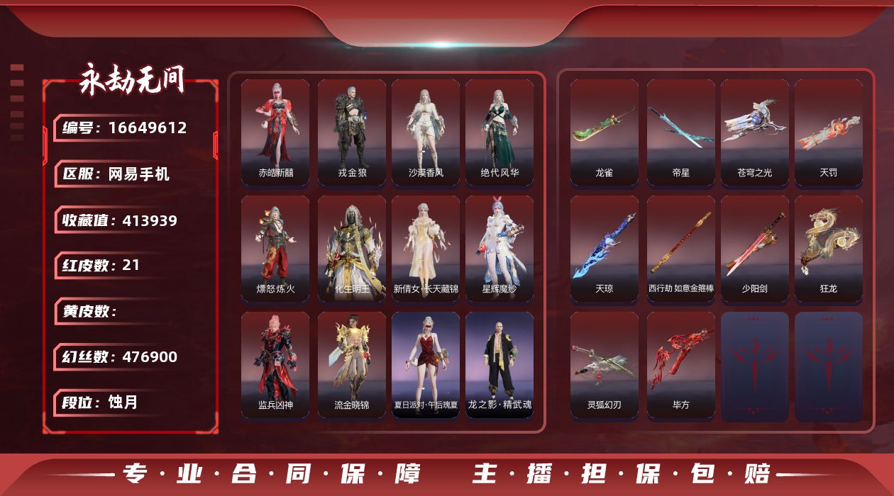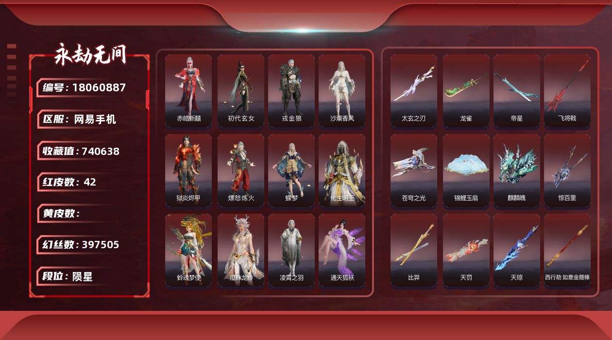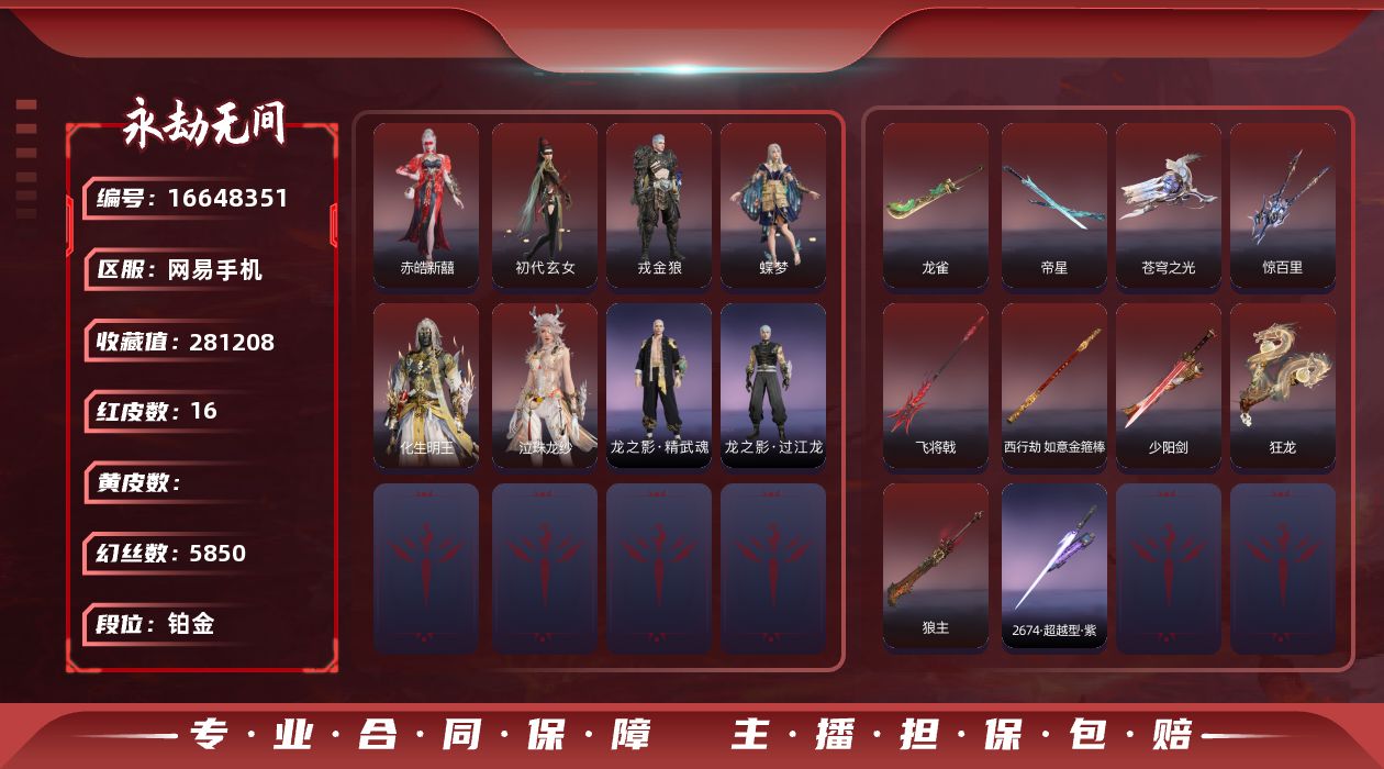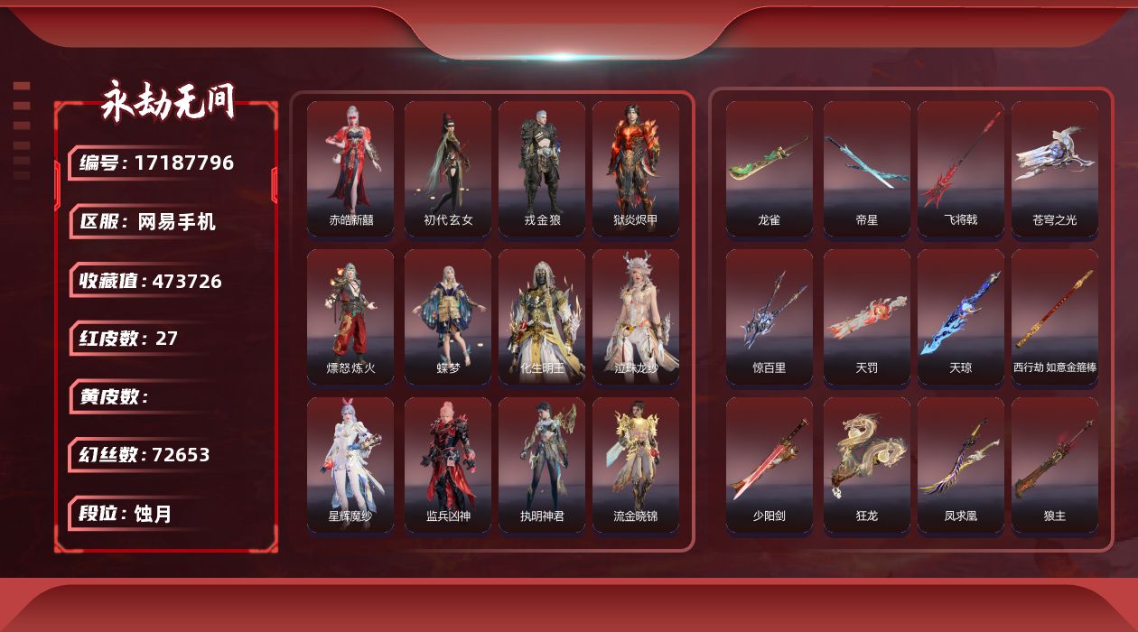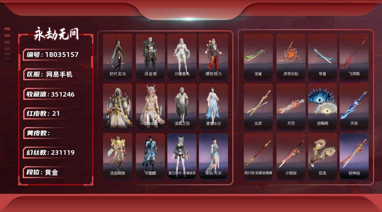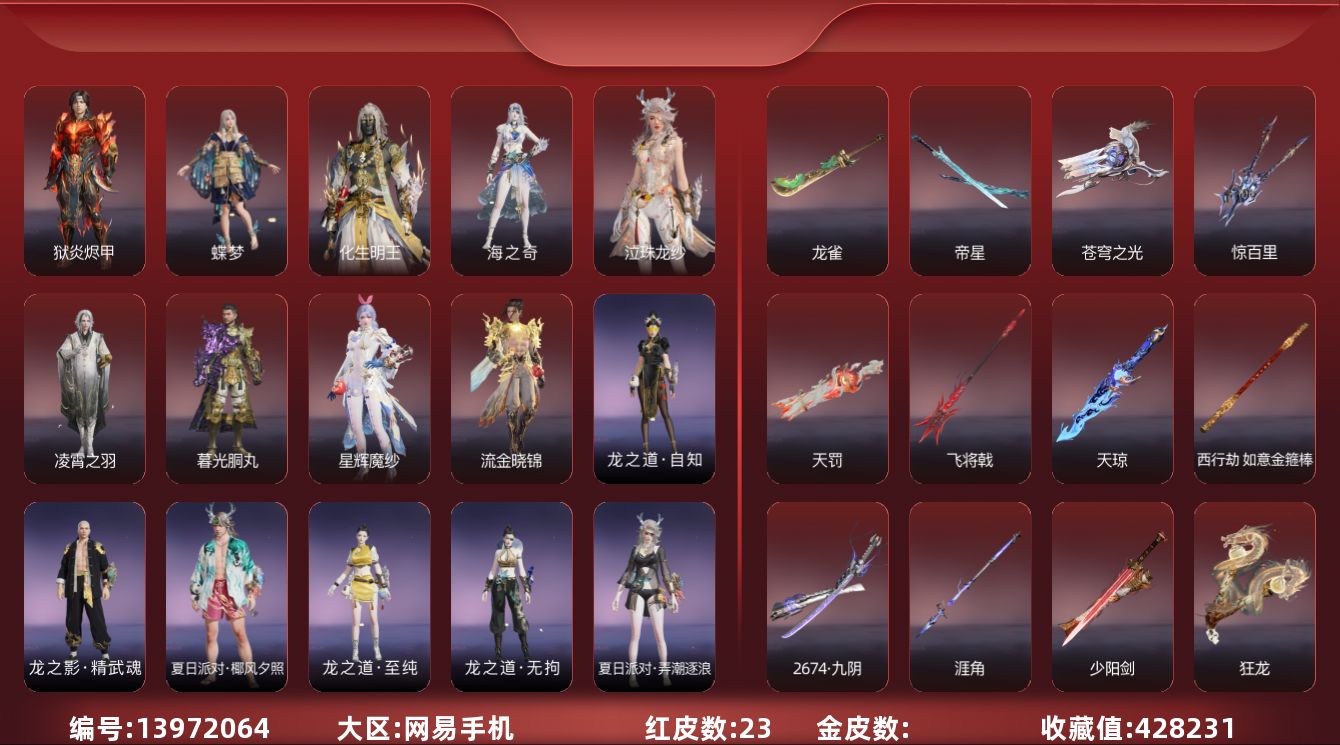 [15004286]10红武 热门红武账号!!!【网易手机】15红 453金 红皮: 墨离(飞索皮肤),初代玄女(宁红叶皮肤),狼主(阔刀皮肤),少阳剑(长剑皮肤),狂龙(双节棍皮肤),泣珠龙纱(崔三娘皮肤),西行劫·如意金箍棒(棍皮肤),飞将戟(斩马刀皮肤),惊百里(双戟皮肤),流金晓锦(刘炼皮肤),苍穹之光(五眼铳皮肤),帝星(横刀皮肤),龙雀(阔刀皮肤),人偶之梦,断昼吟(链剑皮肤) 收藏值:276978 幻丝:96170 精品服饰及变身器奥义:荆魂+ 龙之影·龙虎斗+夏日派对·昭夏流金+夏日派对·高校水着+龙之影·过江龙+劫涛·潮1/29可以换绑,等待期间可以登录网易大神直接进入游戏不影响游戏体验,段位因赛季原因发生变化,以上号为准,头像、发饰、挂饰、魂玉及其他皮肤请看截图