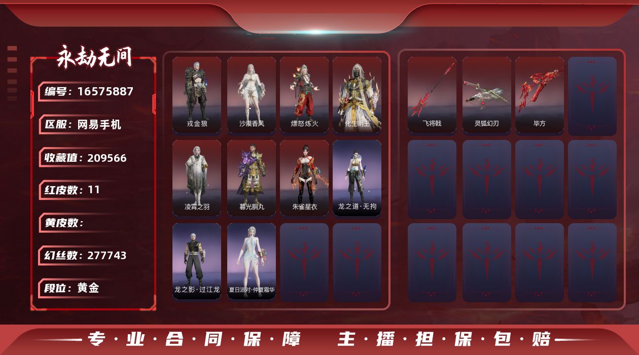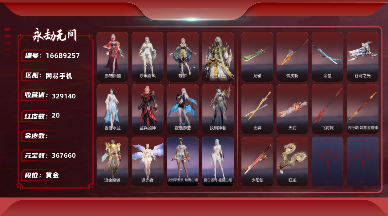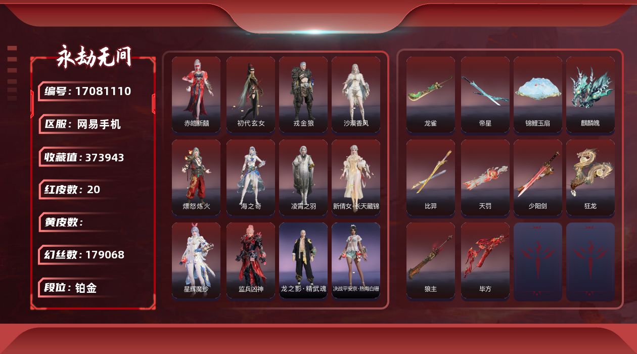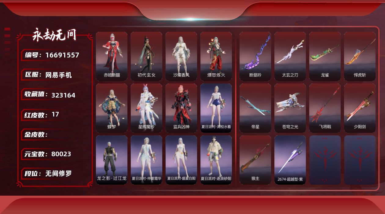 [15004286]10红武 热门红武账号!!!【网易手机】15红 453金 红皮: 墨离(飞索皮肤),初代玄女(宁红叶皮肤),狼主(阔刀皮肤),少阳剑(长剑皮肤),狂龙(双节棍皮肤),泣珠龙纱(崔三娘皮肤),西行劫·如意金箍棒(棍皮肤),飞将戟(斩马刀皮肤),惊百里(双戟皮肤),流金晓锦(刘炼皮肤),苍穹之光(五眼铳皮肤),帝星(横刀皮肤),龙雀(阔刀皮肤),人偶之梦,断昼吟(链剑皮肤) 收藏值:276978 幻丝:96170 精品服饰及变身器奥义:荆魂+ 龙之影·龙虎斗+夏日派对·昭夏流金+夏日派对·高校水着+龙之影·过江龙+劫涛·潮1/29可以换绑,等待期间可以登录网易大神直接进入游戏不影响游戏体验,段位因赛季原因发生变化,以上号为准,头像、发饰、挂饰、魂玉及其他皮肤请看截图永劫无间 - 网易 -