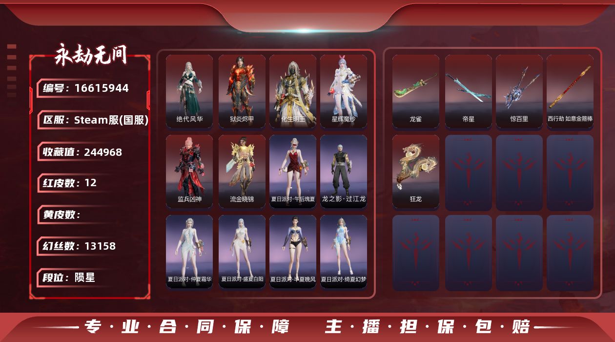 [16615944]WJ4726,steam端游,可换绑,三人段位陨星5,1谪星,12红,349金,谪星飞羽仙,2孔,1紫,1黄,幻梦鲸彩,夜蔷薇,百战枷锁,彩俑娃娃,剪纸彩刀,春木,神君印,墨离,帝星,龙雀,如意金箍棒,狂龙,惊百里,星辉魔纱,化生明王,狱炎烬甲,绝代风华,监兵凶神,流金晓锦,过江龙,灵心,午后瑰夏,仲夏霜华,盛夏白阳,半夏晚风,绮夏幻梦,耀世魂花,碧水青天,九阴圣女,涂鸦少女,李星云,清雅少女,永劫无间 - Steam -