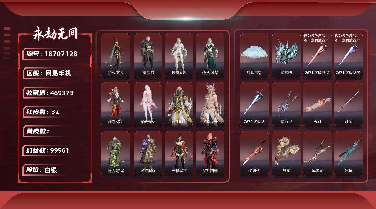 [18707128]WJ6078,网易手机,5月13日可换绑,32红548金,等级340,收藏值469373,三人段位白银1,幻丝99961,金砖371,通行证Lv.1,声望1,雪霜姿,夜蔷薇,楚韵九歌四海,千秋匠心凶虎,红色神品,初樱绮梦发,暮光胴丸,绝代风华,沙漠香风,监兵凶神,朱雀星衣,执明神君,流金晓锦,逐光者,化生明王,戎金狼,初代玄女,熛怒炼火,樱云天女,泣珠龙纱,青龙将星,天罚,毕方,麒麟魄,狼主,涯角,灵犀,锦鲤玉扇,狂龙,凤求凰,少阳剑,冰魄,2674终极型,惊百里,灵狐幻刃,2674终极型紫,2674终极型红,角色金色皮肤,封神录申公豹,灵鹿巫者,金沙梦蜀,若谷,紫微星命,金襦玉衫,夏日派对仲夏霜华,寒英素雪,苍雷丸,千秋匠心玉叶景,神鹰之女,夏日派对昭夏流金,龙门飞天,惊云羽,浣烟纱,龙之道求真,金羽圣鹰,瀚海苍鹰,福瑞天泽,夏日派对椰风夕照,龙之影精武魂,夏日派对午后瑰夏,夏日派对高校水着,龙之道至纯,决战平安京热海白珊,夏日派对弄潮逐浪,龙之影过江龙,永劫无间 - 网易 -