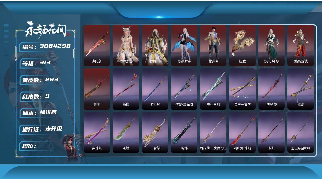 [3064298]【FG0928】金皮数量: 283 红皮数: 9 英雄外观数: 1015 武器外观数: 226 等级: 313 幻丝数: 42952 版本: 标准版 神品及战旗皮: 绝代风华(迦南皮肤),熛怒炼火(季沧海皮肤),狼主(阔刀皮肤),少阳剑(长剑皮肤),狂龙(双节棍皮肤),化生明王(天海皮肤),泣珠龙纱(崔三娘皮肤),夜魅游莹(季莹莹皮肤),化道者(哈迪皮肤) 扇稀有皮: 逍遥