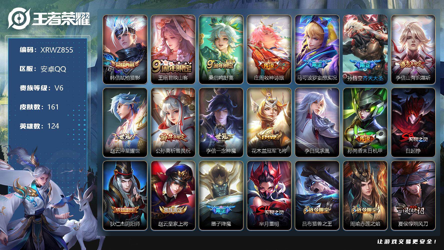 [13231347]Xr42683-安卓Q--V6-至尊星耀IV段位-124英雄-161皮肤-1典藏--12传说-47史诗【英雄全皮】:李信全皮,影全皮【荣耀典藏】:韩信弑枪猎影【传说皮肤】:王昭君映山客,桑启鸣野蒿,庄周牧神诗旅,马可波罗妄想实况,孙悟空齐天大圣,李信山海炽霜斩,赵云淬星耀世,公孙离祈雪灵祝,李信一念神魔,花木兰冠军飞将,李白凤求凰,孙尚香末日机甲【限定皮肤】:白起狰,狄仁杰阴阳师,赵云皇家上将,墨子降魔,芈月重明,吕布猎兽之王,周瑜赤莲之焰,夏侯惇朔风刀,甄姬游园惊梦,曹操烛龙,典韦穷奇,马可波罗暗影游猎,马可波罗妄想实况,狄仁杰魔术师,狄仁杰万华元夜,达摩沙漠行僧,项羽海滩派对,老夫子醍醐杖,程咬金演武夺筹,兰陵王驯魔猎人,兰陵王金庭之子,孙悟空至尊宝,孙悟空齐天大圣,牛魔御旌,李元芳银河之约,李元芳云中旅人,钟馗驱傩正仪,杨玉环遇见飞天,雅典娜黎明之约,蔡文姬繁星吟游,太乙真人饕餮,鬼谷子原初探秘者,鬼谷子五谷丰年,百里玄策原初追逐者,弈星混沌棋,公孙离祈雪灵祝,沈梦溪星空之诺,沈梦溪大漠名商,明世隐疑决卦,裴擒虎李小龙,裴擒虎擒涛扼浪,狂铁御狮,米莱狄御霄,李信山海炽霜斩,盾山御銮,猪八戒西部大镖客,上官婉儿梁祝,上官婉儿天狼绘梦者,鲁班大师探海日志,桑启海盐诗旅,张良古海寻踪,姬小满妄想食味,沈梦溪龙舞盛年【年限皮肤】:李白凤求凰,公孙离祈雪灵祝,李信山海炽霜斩【赛季限定】:白起狰,芈月重明,夏侯惇朔风刀,曹操烛龙,典韦穷奇,狄仁杰万华元夜,达摩沙漠行僧,老夫子醍醐杖,程咬金演武夺筹,兰陵王金庭之子,张良古海寻踪,牛魔御旌,李元芳云中旅人,钟馗驱傩正仪,雅典娜黎明之约,太乙真人饕餮,鬼谷子原初探秘者,百里玄策原初追逐者,弈星混沌棋,沈梦溪大漠名商,明世隐疑决卦,裴擒虎擒涛扼浪,狂铁御狮,米莱狄御霄,盾山御銮,鲁班大师探海日志,桑启海盐诗旅【战令限定】:吕布猎兽之王,周瑜赤莲之焰,马可波罗暗影游猎,兰陵王驯魔猎人,李元芳银河之约,沈梦溪星空之诺,猪八戒西部大镖客【史诗皮肤】:阿轲暗夜猫娘,赵云皇家上将,赵云未来纪元,貂蝉圣诞恋歌,王昭君偶像歌手,狄仁杰魔术师,宫本武藏鬼剑武藏,孙尚香水果甜心,妲己女仆咖啡,吕布末日机甲,张飞乱世虎臣,孙悟空至尊宝,花木兰水晶猎龙者,夏侯惇乘风破浪,甄姬游园惊梦,亚瑟心灵战警,安琪拉心灵骇客,百里守约特工
