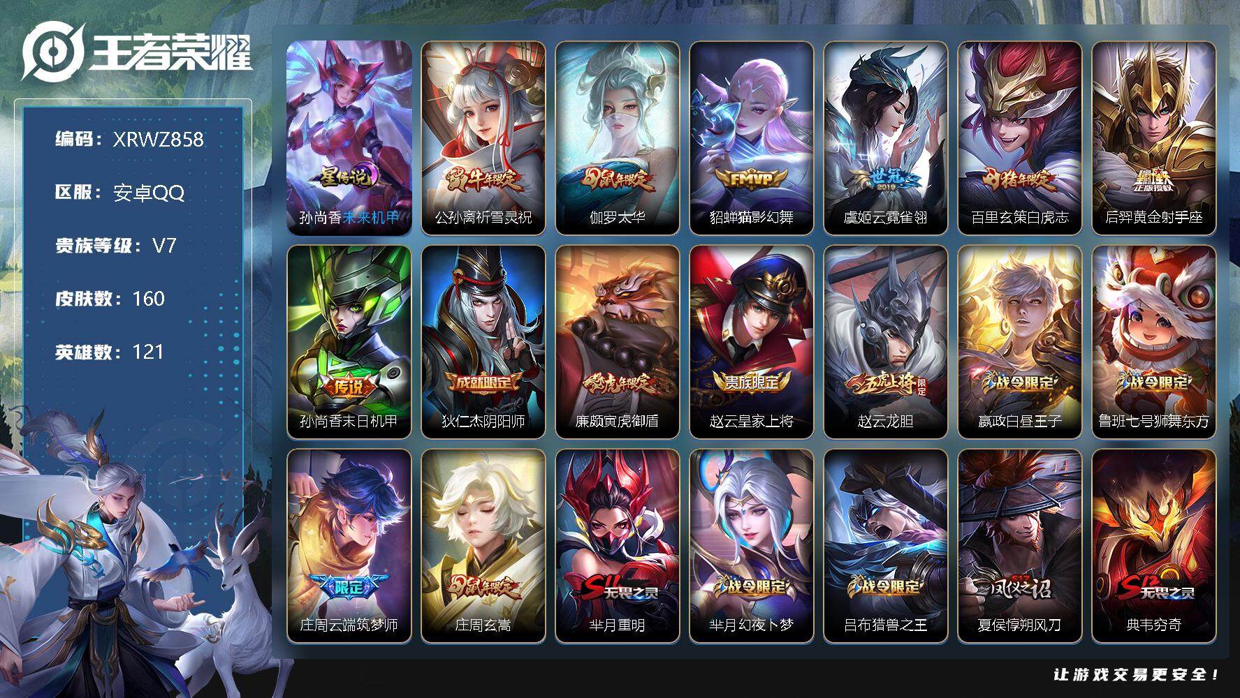 [13245454]Xr43007-可修改-死钱包-安卓Q-V7-荣耀黄金I段位-121英雄-160皮肤-1星元-7传说-39史诗【传说皮肤】:公孙离祈雪灵祝,伽罗太华,貂蝉猫影幻舞,虞姬云霓雀翎,百里玄策白虎志,后羿黄金射手座,孙尚香末日机甲【限定皮肤】:狄仁杰阴阳师,廉颇寅虎御盾,赵云皇家上将,赵云龙胆,嬴政白昼王子,鲁班七号狮舞东方,庄周云端筑梦师,庄周玄嵩,芈月重明,芈月幻夜卜梦,吕布猎兽之王,夏侯惇朔风刀,典韦穷奇,典韦蓝屏警告,狄仁杰魔术师,狄仁杰万华元夜,达摩沙漠行僧,项羽海滩派对,老夫子醍醐杖,韩信飞衡,兰陵王金庭之子,孙悟空至尊宝,孙悟空大圣娶亲,牛魔御旌,后羿如梦令,李元芳银河之约,虞姬霸王别姬,钟馗神迹守卫,钟馗驱傩正仪,杨玉环遇见飞天,女娲朔望之晖,雅典娜单词大作战,蔡文姬繁星吟游,太乙真人饕餮,鬼谷子原初探秘者,苏烈千军破阵,百里玄策白虎志,弈星混沌棋,公孙离祈雪灵祝,沈梦溪星空之诺,沈梦溪大漠名商,明世隐疑决卦,裴擒虎天狼狩猎者,裴擒虎李小龙,裴擒虎擒涛扼浪,狂铁御狮,米莱狄御霄,云中君纤云弄巧,伽罗太华,盾山御銮,上官婉儿梁祝,蒙犽狂想玩偶喵,桑启海盐诗旅,鬼谷子天穹祈灯,姬小满妄想食味【年限皮肤】:百里玄策白虎志,廉颇寅虎御盾,公孙离祈雪灵祝,伽罗太华,韩信飞衡,庄周玄嵩,马超神威,赵云龙胆【赛季限定】:芈月重明,夏侯惇朔风刀,典韦穷奇,狄仁杰万华元夜,达摩沙漠行僧,老夫子醍醐杖,兰陵王金庭之子,牛魔御旌,钟馗驱傩正仪,太乙真人饕餮,鬼谷子原初探秘者,苏烈千军破阵,弈星混沌棋,沈梦溪大漠名商,明世隐疑决卦,裴擒虎擒涛扼浪,狂铁御狮,米莱狄御霄,盾山御銮,桑启海盐诗旅,鬼谷子天穹祈灯【战令限定】:嬴政白昼王子,鲁班七号狮舞东方,芈月幻夜卜梦,吕布猎兽之王,典韦蓝屏警告,李元芳银河之约,钟馗神迹守卫,女娲朔望之晖,雅典娜单词大作战,沈梦溪星空之诺,蒙犽狂想玩偶喵【史诗皮肤】:阿轲暗夜猫娘,赵云皇家上将,赵云未来纪元,貂蝉圣诞恋歌,甄姬冰雪圆舞曲,狄仁杰魔术师,孙尚香水果甜心,妲己魅力维加斯,刘禅绅士熊喵,虞姬霸王别姬,孙悟空至尊宝,花木兰水晶猎龙者,刘邦德古拉伯爵,诸葛亮黄金分割率,庄周云端筑梦师,李元芳逐浪之夏,白起星夜王子,杨玉环遇见飞天,嬴政白昼王子,孙策猫狗日记,孙悟空大圣娶亲,典韦蓝屏警告,裴擒虎天狼狩猎者,鲁班七号狮舞东方,狄仁杰鹰王者荣耀 - QQ(安卓) -