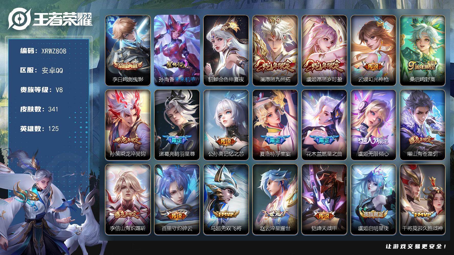 [13525394]Xr43206-安卓Q-V8-永恒钻石V段位-125英雄-341皮肤-1典藏-2星元-24传说-91史诗【英雄全皮】:蒙恬全皮,戈娅全皮【荣耀典藏】:李白鸣剑曳影【传说皮肤】:澜愿照九州拓,虞姬愿照岁时盈,云缨幻光神枪,桑启鸣野蒿,孙策乘龙淬吴钩,诸葛亮鹤羽星尊,公孙离记忆之芯,夏洛特浮生妄,花木兰燃星之曲,虞姬无限倾心,曜山海苍雷引,李信山海炽霜斩,百里守约碎云,马超无双飞将,赵云淬星耀世,铠绛天战甲,虞姬启明星使,干将莫邪久胜战神,达摩黄金狮子座,后羿黄金射手座,貂蝉仲夏夜之梦,李白凤求凰,孙尚香末日机甲,宫本武藏地狱之眼【限定皮肤】:姜子牙天穹之誓,狄仁杰阴阳师,赵云皇家上将,赵云引擎之心,庄周玄嵩,高渐离玩趣恶龙,钟无艳超时空战士,扁鹊奇幻香踪,吕布猎兽之王,甄姬落雪兰心,典韦岱宗,马可波罗暗影游猎,马可波罗山海玄木吟,狄仁杰魔术师,狄仁杰万华元夜,达摩沙漠行僧,项羽海滩派对,老夫子醍醐杖,程咬金演武夺筹,王昭君午后时光,兰陵王金庭之子,花木兰燃星之曲,孙悟空至尊宝,孙悟空孙行者,刘备百相守梦,李元芳银河之约,李元芳匿光侦查者,李元芳云中旅人,虞姬启明星使,虞姬无限倾心,钟馗驱傩正仪,杨戬潮玩骑兵,女娲朔望之晖,雅典娜黎明之约,蔡文姬繁星吟游,鬼谷子原初探秘者,鬼谷子五谷丰年,诸葛亮鹤羽星尊,黄忠烈魂,铠青龙志,弈星混沌棋,沈梦溪星空之诺,沈梦溪大漠名商,沈梦溪匿光破解者,明世隐疑决卦,裴擒虎李小龙,裴擒虎擒涛扼浪,狂铁电玩高手,云中君纤云弄巧,李信山海炽霜斩,伽罗天狼溯光者,猪八戒西部大镖客,上官婉儿梁祝,嫦娥拒霜思,嫦娥暖冬兔眠,曜山海苍雷引,西施玲珑珍味,鲁班大师探海日志,桑启海盐诗旅,夏洛特浮生妄,暃星界游侠,戈娅驭风魔法,艾琳流音漫舞,司空震地狱燃心,阿古朵江河有灵,张良古海寻踪,蒙犽百解令,蒙恬荣光圣徽,高渐离燃音魔法,妲己灵卜魔法,鬼谷子天穹祈灯,姬小满妄想食味,孙策乘龙淬吴钩,沈梦溪龙舞盛年,鲁班七号蔬乡物语,李元芳蔬乡物语,刘邦剑破天穹,程咬金群星魔术团【年限皮肤】:铠青龙志,李白凤求凰,典韦岱宗,庄周玄嵩,黄忠烈魂,马可波罗山海玄木吟,李信山海炽霜斩,曜山海苍雷引,孙策乘龙淬吴钩【赛季限定】:狄仁杰万华元夜,达摩沙漠行僧,老夫子醍醐杖,程咬金演武夺筹,兰陵王金庭之子,张良古海寻踪,李元芳云中旅人,钟馗驱傩正仪,雅典娜黎明之约