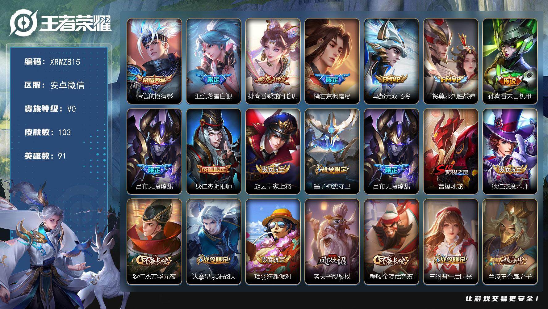 [13525512]Xr43099-安卓WX-V0-荣耀黄金II段位-91英雄-103皮肤-1典藏-0珍品无双-0无双-0珍品传说-7传说-28史诗【英雄全皮】:橘右京全皮【荣耀典藏】:韩信弑枪猎影【传说皮肤】:亚连落雪白狼,孙尚香乘龙问璇玑,橘右京枫霜尽,马超无双飞将,干将莫邪久胜战神,孙尚香末日机甲,吕布天魔缭乱【限定皮肤】:狄仁杰阴阳师,赵云皇家上将,墨子神迹守卫,吕布天魔缭乱,曹操烛龙,狄仁杰魔术师,狄仁杰万华元夜,达摩星际陆战队,项羽海滩派对,老夫子醍醐杖,程咬金演武夺筹,王昭君午后时光,兰陵王金庭之子,橘右京枫霜尽,李元芳云中旅人,钟馗驱傩正仪,百里玄策原初追逐者,百里守约朱雀志,沈梦溪大漠名商,明世隐疑决卦,狂铁电玩高手,米莱狄胡桃异想国,高渐离燃音魔法,妲己灵卜魔法,鬼谷子天穹祈灯,伽罗琥珀纪元,孙尚香乘龙问璇玑,亚连落雪白狼,沈梦溪龙舞盛年,鲁班七号蔬乡物语,李元芳蔬乡物语,刘邦剑破天穹【年限皮肤】:百里守约朱雀志,孙尚香乘龙问璇玑【赛季限定】:曹操烛龙,狄仁杰万华元夜,老夫子醍醐杖,程咬金演武夺筹,兰陵王金庭之子,李元芳云中旅人,钟馗驱傩正仪,百里玄策原初追逐者,沈梦溪大漠名商,明世隐疑决卦,鬼谷子天穹祈灯,刘邦剑破天穹【战令限定】:墨子神迹守卫,达摩星际陆战队,王昭君午后时光,狂铁电玩高手,米莱狄胡桃异想国,高渐离燃音魔法,妲己灵卜魔法,鲁班七号蔬乡物语,李元芳蔬乡物语【史诗皮肤】:赵云皇家上将,赵云未来纪元,狄仁杰魔术师,宫本武藏鬼剑武藏,妲己魅力维加斯,妲己女仆咖啡,吕布圣诞狂欢,李白千年之狐,吕布末日机甲,张飞乱世虎臣,韩信白龙吟,刘邦德古拉伯爵,兰陵王暗隐猎兽者,诸葛亮黄金分割率,安琪拉心灵骇客,铠曙光守护者,程咬金功夫厨神,百里守约朱雀志,狄仁杰鹰眼统帅,不知火舞魅语,橘右京修罗,百里玄策原初追逐者,米莱狄胡桃异想国,澜赏金猎手,狂铁电玩高手,妲己灵卜魔法,高渐离燃音魔法,伽罗琥珀纪元,鲁班七号蔬乡物语【其他皮肤】:项羽海滩派对,韩信街头霸王,达摩大发明家,牛魔西部大镖客,扁鹊化身博士,宫本武藏未来纪元,妲己少女阿狸,亚瑟死亡骑士,花木兰兔女郎,甄姬花好人间,狄仁杰阴阳师,关羽龙腾万里,钟无艳海滩丽影,曹操烛龙,王昭君幻想奇妙夜,李白敏锐之力,苏烈坚韧之力,孙膑归虚梦演,姜子牙炽热元素使,明世隐疑决卦,老夫子醍醐杖,狂铁特工战影,狄仁