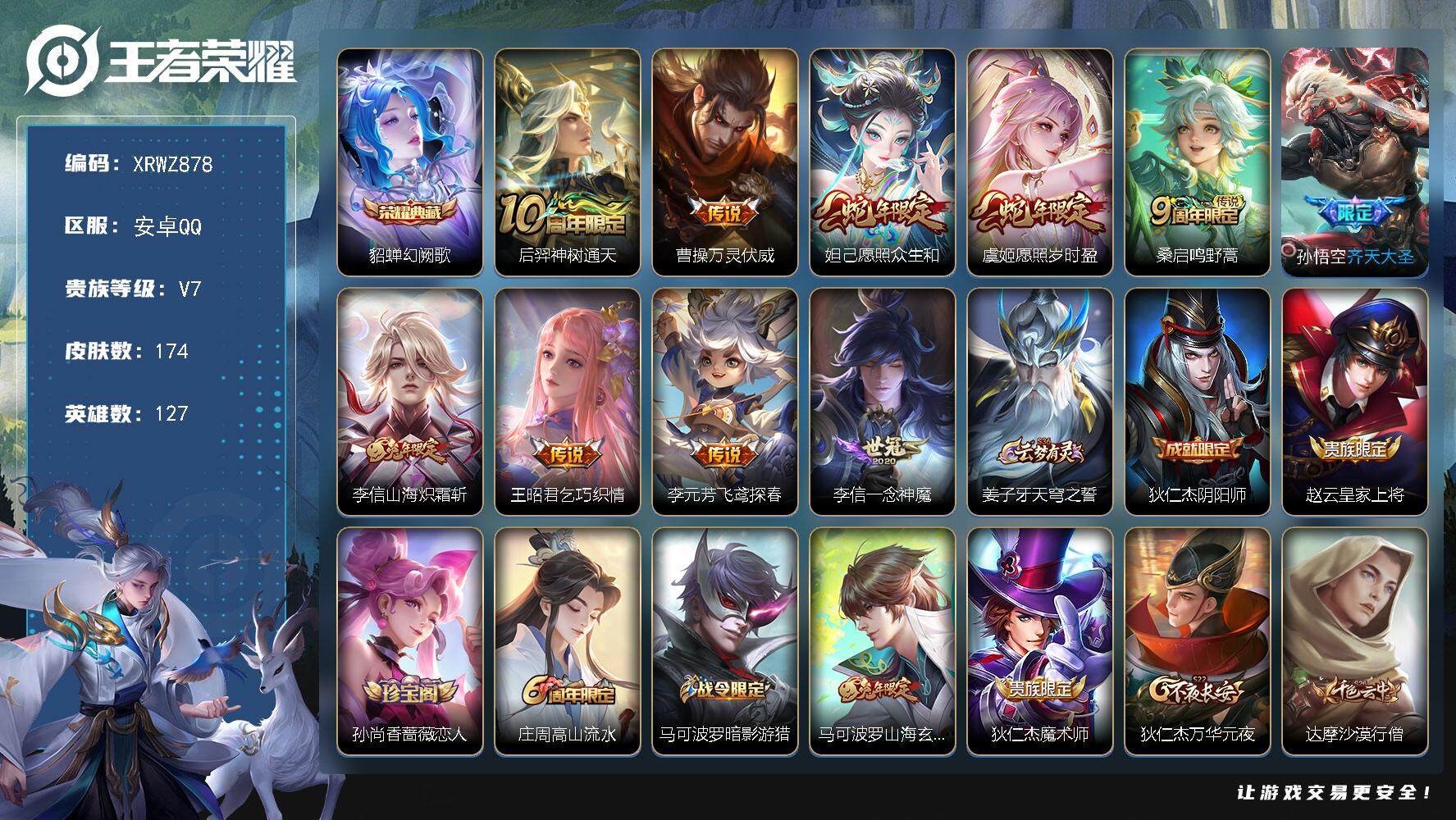 [13594625]Xr42650-安卓Q-V7-可二次-最强王者段位-127英雄-174皮肤-1典藏-10传说-41史诗【英雄全皮】:孙权全皮,李信全皮【荣耀典藏】:貂蝉幻阙歌【传说皮肤】:后羿神树通天,曹操万灵伏威,妲己愿照众生和,虞姬愿照岁时盈,桑启鸣野蒿,孙悟空齐天大圣,李信山海炽霜斩,王昭君乞巧织情,李元芳飞鸢探春,李信一念神魔【限定皮肤】:姜子牙天穹之誓,狄仁杰阴阳师,赵云皇家上将,孙尚香蔷薇恋人,庄周高山流水,马可波罗暗影游猎,马可波罗山海玄木吟,狄仁杰魔术师,狄仁杰万华元夜,达摩沙漠行僧,项羽海滩派对,老夫子醍醐杖,程咬金演武夺筹,兰陵王金庭之子,孙悟空齐天大圣,钟馗驱傩正仪,鬼谷子原初探秘者,百里守约朱雀志,梦奇顽趣,明世隐疑决卦,裴擒虎擒涛扼浪,云中君纤云弄巧,李信山海炽霜斩,上官婉儿梁祝,嫦娥暖冬兔眠,鲁班大师探海日志,桑启海盐诗旅,暃星界游侠,艾琳女武神,阿古朵江河有灵,张良古海寻踪,高渐离燃音魔法,妲己灵卜魔法,鬼谷子天穹祈灯,沈梦溪龙舞盛年,刘邦剑破天穹,周瑜熔金海岸【年限皮肤】:百里守约朱雀志,马可波罗山海玄木吟,李信山海炽霜斩【赛季限定】:狄仁杰万华元夜,达摩沙漠行僧,老夫子醍醐杖,程咬金演武夺筹,兰陵王金庭之子,张良古海寻踪,钟馗驱傩正仪,鬼谷子原初探秘者,梦奇顽趣,明世隐疑决卦,裴擒虎擒涛扼浪,鲁班大师探海日志,桑启海盐诗旅,鬼谷子天穹祈灯,刘邦剑破天穹,姜子牙天穹之誓【战令限定】:马可波罗暗影游猎,嫦娥暖冬兔眠,暃星界游侠,高渐离燃音魔法,妲己灵卜魔法【史诗皮肤】:鲁班七号电玩小子,赵云皇家上将,貂蝉圣诞恋歌,甄姬冰雪圆舞曲,王昭君偶像歌手,狄仁杰魔术师,宫本武藏鬼剑武藏,孙尚香蔷薇恋人,孙尚香水果甜心,妲己魅力维加斯,墨子龙骑士,墨子金属风暴,曹操幽灵船长,吕布末日机甲,张飞乱世虎臣,刘邦德古拉伯爵,兰陵王暗隐猎兽者,安琪拉心灵骇客,铠曙光守护者,蔡文姬舞动绿茵,李元芳逐浪之夏,阿轲节奏热浪,孙策猫狗日记,大乔猫狗日记,百里守约朱雀志,狄仁杰鹰眼统帅,上官婉儿梁祝,马可波罗暗影游猎,云中君纤云弄巧,杨戬天秀启明,庄周高山流水,梦奇顽趣,暃星界游侠,马可波罗山海玄木吟,刘禅电玩爆裂旋风,阿古朵江河有灵,妲己灵卜魔法,高渐离燃音魔法,百里守约百相守梦,牛魔星界战将,孙膑茶境仙,赵怀真器灵浮梦炉【其他皮肤】:项羽海滩派对,韩信教廷特王者荣耀 - QQ(安卓) -