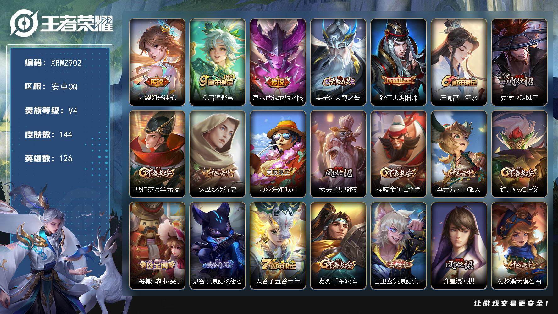 [13886045]Xr44927-安卓Q-V4-无二次-最强王者段位-126英雄-144皮肤-0典藏-0珍品无双-0无双-0珍品传说-3传说-20史诗【英雄全皮】:影全皮【传说皮肤】:云缨幻光神枪,桑启鸣野蒿,宫本武藏地狱之眼【限定皮肤】:姜子牙天穹之誓,狄仁杰阴阳师,庄周高山流水,夏侯惇朔风刀,狄仁杰万华元夜,达摩沙漠行僧,项羽海滩派对,老夫子醍醐杖,程咬金演武夺筹,李元芳云中旅人,钟馗驱傩正仪,干将莫邪胡桃夹子,鬼谷子原初探秘者,鬼谷子五谷丰年,苏烈千军破阵,百里玄策原初追逐者,弈星混沌棋,沈梦溪大漠名商,明世隐疑决卦,裴擒虎擒涛扼浪,米莱狄御霄,猪八戒西部大镖客,鲁班大师探海日志,桑启海盐诗旅,鬼谷子天穹祈灯,沈梦溪龙舞盛年【赛季限定】:夏侯惇朔风刀,狄仁杰万华元夜,达摩沙漠行僧,老夫子醍醐杖,程咬金演武夺筹,李元芳云中旅人,钟馗驱傩正仪,鬼谷子原初探秘者,苏烈千军破阵,百里玄策原初追逐者,弈星混沌棋,沈梦溪大漠名商,明世隐疑决卦,裴擒虎擒涛扼浪,米莱狄御霄,鲁班大师探海日志,桑启海盐诗旅,鬼谷子天穹祈灯,姜子牙天穹之誓【战令限定】:猪八戒西部大镖客【史诗皮肤】:宫本武藏鬼剑武藏,孙尚香水果甜心,嬴政摇滚巨星,妲己魅力维加斯,妲己女仆咖啡,刘禅绅士熊喵,吕布末日机甲,张飞乱世虎臣,花木兰水晶猎龙者,雅典娜冰冠公主,阿轲节奏热浪,狄仁杰鹰眼统帅,百里玄策原初追逐者,庄周高山流水,鬼谷子五谷丰年,镜玫瑰异探,百里守约百相守梦,扁鹊灵蛊蚀心,黄忠百相守梦,女娲万灵启世【其他皮肤】:项羽海滩派对,韩信教廷特使,韩信街头霸王,露娜哥特玫瑰,赵云白执事,赵云忍炎影,芈月红桃皇后,白起白色死神,扁鹊救世之瞳,宫本武藏未来纪元,孙膑天使之翼,妲己少女阿狸,典韦黄金武士,亚瑟死亡骑士,达摩拳王,花木兰兔女郎,甄姬花好人间,宫本武藏万象初新,后羿阿尔法小队,狄仁杰阴阳师,刘备纽约教父,刘备汉昭烈帝,关羽龙腾万里,钟无艳海滩丽影,老夫子功夫老勺,诸葛亮掌控之力,李白敏锐之力,鬼谷子幻乐之宴,米莱狄御霄,小乔丁香结,吕布野性能量,沈梦溪鲨炮海盗猫,夏侯惇朔风刀,弈星混沌棋,哪吒次元突破,明世隐疑决卦,老夫子醍醐杖,猪八戒西部大镖客,狂铁特工战影,鬼谷子原初探秘者,狄仁杰万华元夜,程咬金演武夺筹,钟馗驱傩正仪,鲁班大师乓乓大师,苏烈千军破阵,干将莫邪胡桃夹子,达摩沙漠行僧,沈梦溪大漠名商王者荣耀 - QQ(安卓) -