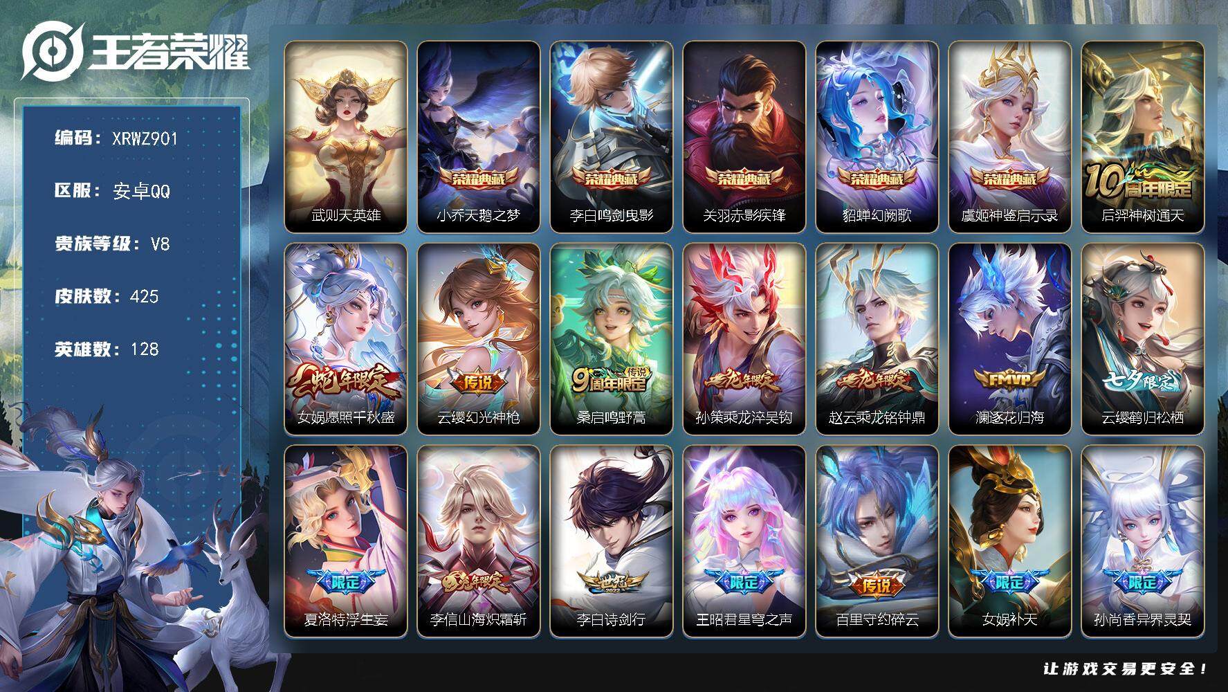 [13886121]Xr43088-安卓Q-V8-可二次-最强王者段位-128英雄-425皮肤-5典藏--23传说-136史诗【英雄全皮】:刘邦全皮,孙权全皮,钟馗全皮,女娲全皮,鬼谷子全皮,蒙恬全皮,影全皮,海诺全皮【荣耀典藏】:武则天英雄,小乔天鹅之梦,李白鸣剑曳影,关羽赤影疾锋,貂蝉幻阙歌,虞姬神鉴启示录【传说皮肤】:后羿神树通天,女娲愿照千秋盛,云缨幻光神枪,桑启鸣野蒿,孙策乘龙淬吴钩,赵云乘龙铭钟鼎,澜逐花归海,云缨鹤归松栖,夏洛特浮生妄,李信山海炽霜斩,李白诗剑行,王昭君星穹之声,百里守约碎云,女娲补天,孙尚香异界灵契,西施游龙清影,诸葛亮时雨天司,虞姬启明星使,达摩黄金狮子座,花木兰冠军飞将,貂蝉仲夏夜之梦,宫本武藏地狱之眼,武则天海洋之心【限定皮肤】:白起狰,蔡文姬夏日便利店,大乔绒语心约,虞姬夏日便利店,姜子牙天穹之誓,狄仁杰阴阳师,虞姬凯尔特女王,赵云皇家上将,妲己时之彼端,嬴政优雅恋人,嬴政白昼王子,孙尚香异界灵契,鲁班七号狮舞东方,庄周高山流水,高渐离死亡摇滚,高渐离玩趣恶龙,阿轲迷踪丽影,钟无艳王者之锤,钟无艳超时空战士,扁鹊奇幻香踪,芈月重明,芈月白晶晶,芈月幻夜卜梦,元歌云间偶戏,元歌无心,夏侯惇朔风刀,甄姬游园惊梦,甄姬落雪兰心,曹操烛龙,典韦穷奇,典韦蓝屏警告,马可波罗山海玄木吟,狄仁杰魔术师,狄仁杰万华元夜,达摩沙漠行僧,项羽海滩派对,老夫子醍醐杖,关羽百相守梦,程咬金演武夺筹,刘邦夺宝奇兵,韩信傲雪梅枪,王昭君星穹之声,兰陵王驯魔猎人,兰陵王金庭之子,花木兰青春决赛季,花木兰默契交锋,亚瑟潮玩骑士王,孙悟空至尊宝,牛魔御旌,后羿如梦令,后羿圣弓游侠,李元芳银河之约,李元芳云中旅人,虞姬霸王别姬,虞姬启明星使,钟馗神迹守卫,钟馗驱傩正仪,杨玉环遇见飞天,杨戬潮玩骑兵,女娲朔望之晖,女娲补天,干将莫邪冰霜恋舞曲,干将莫邪真爱魔法,雅典娜单词大作战,雅典娜黎明之约,蔡文姬繁星吟游,太乙真人饕餮,太乙真人华丽摇滚,鬼谷子原初探秘者,鬼谷子五谷丰年,诸葛亮时雨天司,黄忠火炮绅士,苏烈千军破阵,百里玄策原初追逐者,百里守约朱雀志,弈星混沌棋,梦奇顽趣,公孙离蜜橘之夏,沈梦溪星空之诺,沈梦溪大漠名商,沈梦溪匿光破解者,明世隐疑决卦,裴擒虎李小龙,裴擒虎擒涛扼浪,狂铁御狮,米莱狄御霄,瑶山海碧波行,云中君纤云弄巧,李信山海炽霜斩,盾山御銮,上官婉儿梁祝,王者荣耀 - QQ(安卓) -