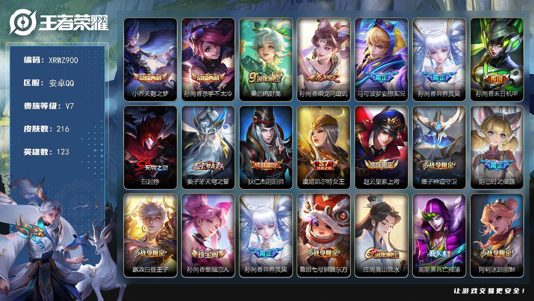 [13886126]Xr43414-安卓Q-V7-最强王者段位-123英雄-216皮肤-2典藏-0珍品无双-0无双-0珍品传说-5传说-53史诗【英雄全皮】:猪八戒全皮【荣耀典藏】:小乔天鹅之梦,孙尚香杀手不太冷【传说皮肤】:桑启鸣野蒿,孙尚香乘龙问璇玑,马可波罗妄想实况,孙尚香异界灵契,孙尚香末日机甲【限定皮肤】:白起狰,姜子牙天穹之誓,狄仁杰阴阳师,虞姬凯尔特女王,赵云皇家上将,墨子神迹守卫,妲己时之彼端,嬴政白昼王子,孙尚香蔷薇恋人,孙尚香异界灵契,鲁班七号狮舞东方,庄周高山流水,高渐离死亡摇滚,阿轲迷踪丽影,扁鹊炼金王,芈月重明,吕布猎兽之王,周瑜赤莲之焰,夏侯惇朔风刀,曹操烛龙,典韦穷奇,马可波罗暗影游猎,马可波罗山海玄木吟,马可波罗妄想实况,狄仁杰魔术师,狄仁杰万华元夜,达摩沙漠行僧,项羽海滩派对,老夫子醍醐杖,老夫子航海奇遇记,程咬金演武夺筹,刘邦夺宝奇兵,兰陵王驯魔猎人,兰陵王金庭之子,牛魔御旌,李元芳云中旅人,钟馗神迹守卫,钟馗驱傩正仪,雅典娜黎明之约,太乙真人饕餮,太乙真人华丽摇滚,鬼谷子原初探秘者,鬼谷子五谷丰年,苏烈千军破阵,百里玄策原初追逐者,弈星混沌棋,梦奇顽趣,沈梦溪大漠名商,明世隐疑决卦,裴擒虎李小龙,裴擒虎擒涛扼浪,狂铁御狮,米莱狄御霄,盾山御銮,猪八戒西部大镖客,猪八戒猪悟能,上官婉儿梁祝,嫦娥拒霜思,嫦娥暖冬兔眠,鲁班大师探海日志,桑启海盐诗旅,暃星界游侠,艾琳女武神,艾琳流音漫舞,司空震地狱燃心,阿古朵江河有灵,张良古海寻踪,蒙恬荣光圣徽,鬼谷子天穹祈灯,孙尚香乘龙问璇玑,刘邦剑破天穹【年限皮肤】:马可波罗山海玄木吟,孙尚香乘龙问璇玑【赛季限定】:扁鹊炼金王,白起狰,芈月重明,夏侯惇朔风刀,曹操烛龙,典韦穷奇,狄仁杰万华元夜,达摩沙漠行僧,老夫子醍醐杖,程咬金演武夺筹,兰陵王金庭之子,张良古海寻踪,牛魔御旌,李元芳云中旅人,虞姬凯尔特女王,钟馗驱傩正仪,雅典娜黎明之约,太乙真人饕餮,鬼谷子原初探秘者,苏烈千军破阵,百里玄策原初追逐者,弈星混沌棋,梦奇顽趣,沈梦溪大漠名商,明世隐疑决卦,裴擒虎擒涛扼浪,狂铁御狮,米莱狄御霄,盾山御銮,鲁班大师探海日志,桑启海盐诗旅,鬼谷子天穹祈灯,蒙恬荣光圣徽,刘邦剑破天穹,姜子牙天穹之誓【战令限定】:墨子神迹守卫,嬴政白昼王子,鲁班七号狮舞东方,阿轲迷踪丽影,吕布猎兽之王,周瑜赤莲之焰,马可波罗暗王者荣耀 - QQ(安卓) -