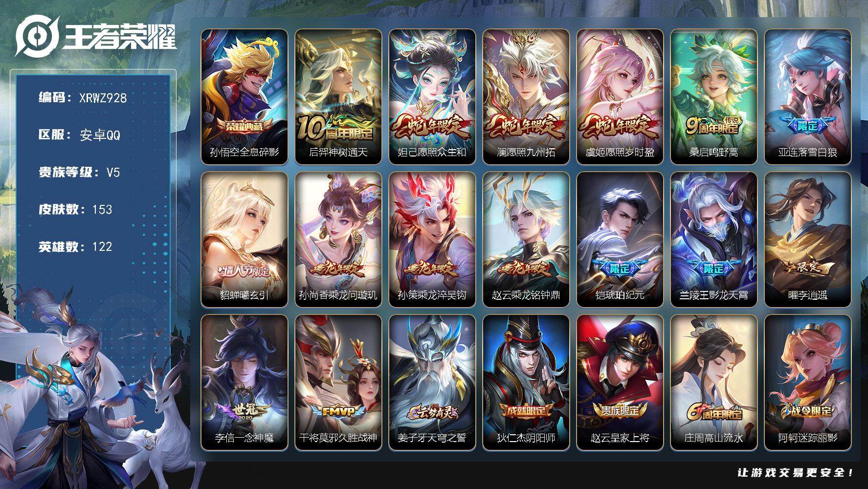 [14117337]xr46479-安卓Q-V6-最强王者段位-122英雄-153皮肤-1典藏-0珍品无双-0无双-0珍品传说-15传说-43史诗【荣耀典藏】:孙悟空全息碎影【传说皮肤】:后羿神树通天,妲己愿照众生和,澜愿照九州拓,虞姬愿照岁时盈,桑启鸣野蒿,亚连落雪白狼,貂蝉曦玄引,孙尚香乘龙问璇玑,孙策乘龙淬吴钩,赵云乘龙铭钟鼎,铠琥珀纪元,兰陵王影龙天霄,曜李逍遥 ,李信一念神魔,干将莫邪久胜战神【限定皮肤】:姜子牙天穹之誓,狄仁杰阴阳师,赵云皇家上将,庄周高山流水,阿轲迷踪丽影,马可波罗暗影游猎,狄仁杰魔术师,项羽海滩派对,兰陵王影龙天霄,孙悟空孙行者,后羿圣弓游侠,女娲朔望之晖,干将莫邪真爱魔法,苏烈千军破阵,裴擒虎李小龙,曜李逍遥 ,鲁班大师探海日志,阿古朵江河有灵,张良古海寻踪,鬼谷子天穹祈灯,伽罗琥珀纪元,铠琥珀纪元,姬小满妄想食味,安琪拉乘龙聚宝船,孙尚香乘龙问璇玑,孙策乘龙淬吴钩,赵云乘龙铭钟鼎,貂蝉曦玄引,亚连落雪白狼,沈梦溪龙舞盛年,鲁班七号蔬乡物语,李元芳蔬乡物语,刘邦剑破天穹,程咬金群星魔术团【年限皮肤】:安琪拉乘龙聚宝船,孙尚香乘龙问璇玑,孙策乘龙淬吴钩,赵云乘龙铭钟鼎【赛季限定】:张良古海寻踪,苏烈千军破阵,鲁班大师探海日志,鬼谷子天穹祈灯,刘邦剑破天穹,姜子牙天穹之誓【战令限定】:阿轲迷踪丽影,马可波罗暗影游猎,后羿圣弓游侠,女娲朔望之晖,干将莫邪真爱魔法,鲁班七号蔬乡物语,李元芳蔬乡物语【史诗皮肤】:鲁班七号电玩小子,露娜紫霞仙子,赵云皇家上将,赵云未来纪元,甄姬冰雪圆舞曲,狄仁杰魔术师,廉颇地狱岩魂,宫本武藏鬼剑武藏,孙尚香水果甜心,妲己女仆咖啡,墨子金属风暴,吕布圣诞狂欢,曹操幽灵船长,刘邦德古拉伯爵,夏侯惇乘风破浪,兰陵王暗隐猎兽者,亚瑟心灵战警,百里守约特工魅影,刘禅天才门将,白起星夜王子,阿轲节奏热浪,孙策猫狗日记,狄仁杰鹰眼统帅,娜可露露晚萤,阿轲迷踪丽影,马可波罗暗影游猎,裴擒虎李小龙,干将莫邪真爱魔法,钟馗乐园奇幻夜,孙悟空孙行者,庄周高山流水,哪吒雪上飞焰,阿古朵江河有灵,伽罗琥珀纪元,姬小满妄想食味,安琪拉乘龙聚宝船,鲁班七号蔬乡物语,百里守约百相守梦,孙膑茶境仙,赵怀真器灵浮梦炉,阿轲化蝶舞,狂铁龙之律动,百里玄策罗小黑战记【其他皮肤】:项羽海滩派对,韩信街头霸王,露娜哥特玫瑰,牛魔西部大镖客,孙膑天使之翼,典王者荣耀 - QQ(安卓) -