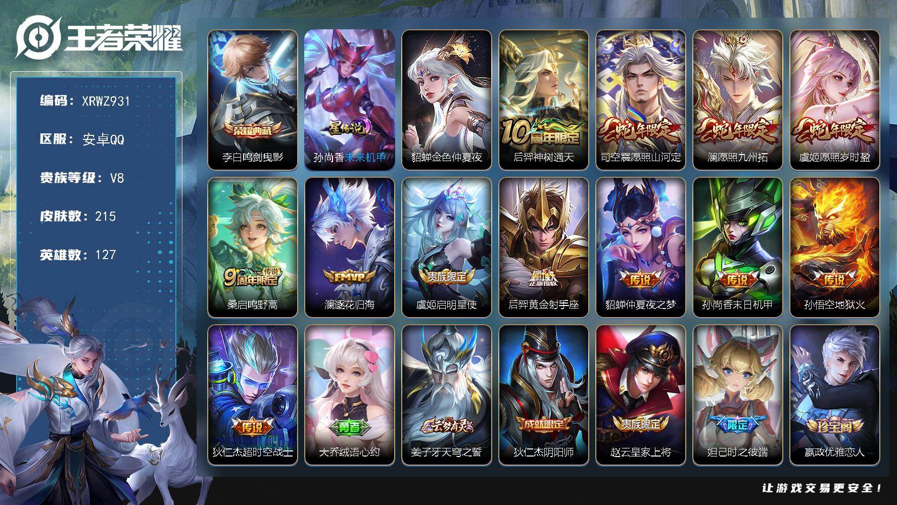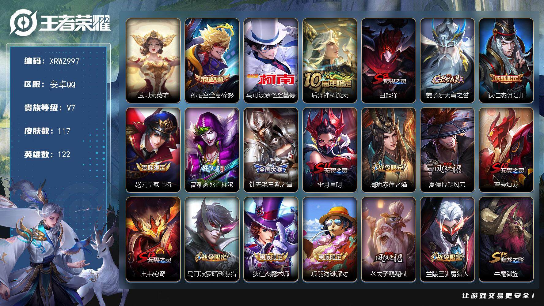 [14788822]Xr46153-安卓Q--V7-最强王者段位-122英雄-117皮肤-1典藏皮肤-1典藏英雄-1珍品传说-1传说-23史诗【荣耀典藏】:武则天英雄,孙悟空全息碎影【珍品传说】:马可波罗怪盗基德【传说皮肤】:后羿神树通天【限定皮肤】:白起狰,姜子牙天穹之誓,狄仁杰阴阳师,赵云皇家上将,高渐离死亡摇滚,钟无艳王者之锤,芈月重明,周瑜赤莲之焰,夏侯惇朔风刀,曹操烛龙,典韦穷奇,马可波罗暗影游猎,狄仁杰魔术师,项羽海滩派对,老夫子醍醐杖,兰陵王驯魔猎人,牛魔御旌,李元芳银河之约,杨玉环遇见飞天,雅典娜单词大作战,太乙真人饕餮,鬼谷子原初探秘者,弈星混沌棋,沈梦溪星空之诺,明世隐疑决卦,裴擒虎李小龙,狂铁御狮,米莱狄御霄,盾山御銮,猪八戒西部大镖客,上官婉儿梁祝,蒙犽狂想玩偶喵,桑启海盐诗旅,艾琳女武神,阿古朵江河有灵,刘邦剑破天穹,周瑜熔金海岸【赛季限定】:白起狰,芈月重明,夏侯惇朔风刀,曹操烛龙,典韦穷奇,老夫子醍醐杖,牛魔御旌,太乙真人饕餮,鬼谷子原初探秘者,弈星混沌棋,明世隐疑决卦,狂铁御狮,米莱狄御霄,盾山御銮,桑启海盐诗旅,刘邦剑破天穹,姜子牙天穹之誓【战令限定】:周瑜赤莲之焰,马可波罗暗影游猎,兰陵王驯魔猎人,李元芳银河之约,雅典娜单词大作战,沈梦溪星空之诺,猪八戒西部大镖客,蒙犽狂想玩偶喵【史诗皮肤】:鲁班七号电玩小子,钟无艳王者之锤,赵云皇家上将,狄仁杰魔术师,宫本武藏鬼剑武藏,孙尚香水果甜心,墨子龙骑士,吕布圣诞狂欢,小乔缤纷独角兽,诸葛亮黄金分割率,亚瑟心灵战警,雅典娜冰冠公主,杨玉环遇见飞天,狄仁杰鹰眼统帅,兰陵王驯魔猎人,上官婉儿梁祝,李元芳银河之约,马可波罗暗影游猎,蒙犽狂想玩偶喵,裴擒虎李小龙,阿古朵顽趣,阿古朵江河有灵,少司缘巫礼祀神【其他皮肤】:项羽海滩派对,韩信教廷特使,阿轲爱心护理,赵云忍炎影,艾琳女武神,程咬金星际陆战队,扁鹊化身博士,扁鹊救世之瞳,宫本武藏未来纪元,姜子牙时尚教父,妲己少女阿狸,亚瑟死亡骑士,达摩拳王,张飞五福同心,甄姬花好人间,宫本武藏万象初新,后羿阿尔法小队,狄仁杰阴阳师,高渐离死亡摇滚,关羽龙腾万里,白起狰,钟无艳海滩丽影,太乙真人饕餮,宫本武藏霸王丸,曹操烛龙,芈月重明,老夫子功夫老勺,典韦穷奇,鬼谷子幻乐之宴,狂铁御狮,安琪拉如懿,苏烈坚韧之力,项羽科学大爆炸,米莱狄御霄,牛魔御旌,小