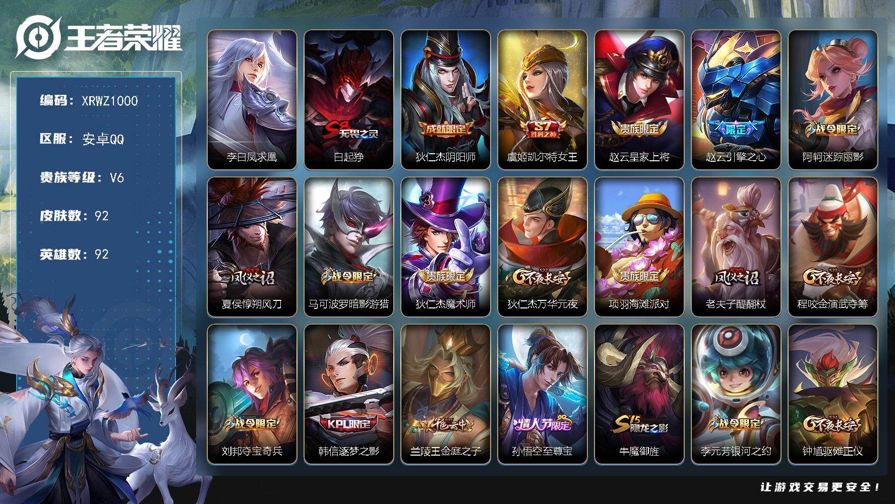 [14872997]Xr46981-可修改-安卓Q-V6-荣耀黄金IV段位-92英雄-92皮肤-1传说-21史诗【传说皮肤】:李白凤求凰【限定皮肤】:白起狰,狄仁杰阴阳师,虞姬凯尔特女王,赵云皇家上将,赵云引擎之心,阿轲迷踪丽影,夏侯惇朔风刀,马可波罗暗影游猎,狄仁杰魔术师,狄仁杰万华元夜,项羽海滩派对,老夫子醍醐杖,程咬金演武夺筹,刘邦夺宝奇兵,韩信逐梦之影,兰陵王金庭之子,孙悟空至尊宝,牛魔御旌,李元芳银河之约,钟馗驱傩正仪,雅典娜单词大作战,蔡文姬繁星吟游,鬼谷子原初探秘者,苏烈千军破阵,弈星混沌棋,沈梦溪星空之诺,明世隐疑决卦,裴擒虎李小龙,狂铁御狮,米莱狄御霄,盾山御銮,猪八戒西部大镖客,上官婉儿梁祝,蒙犽狂想玩偶喵【年限皮肤】:李白凤求凰【赛季限定】:白起狰,夏侯惇朔风刀,狄仁杰万华元夜,老夫子醍醐杖,程咬金演武夺筹,兰陵王金庭之子,牛魔御旌,虞姬凯尔特女王,钟馗驱傩正仪,鬼谷子原初探秘者,苏烈千军破阵,弈星混沌棋,明世隐疑决卦,狂铁御狮,米莱狄御霄,盾山御銮【战令限定】:阿轲迷踪丽影,马可波罗暗影游猎,刘邦夺宝奇兵,李元芳银河之约,雅典娜单词大作战,沈梦溪星空之诺,猪八戒西部大镖客,蒙犽狂想玩偶喵【史诗皮肤】:赵云皇家上将,狄仁杰魔术师,廉颇地狱岩魂,孙尚香水果甜心,妲己魅力维加斯,曹操幽灵船长,李白千年之狐,韩信白龙吟,孙悟空至尊宝,赵云引擎之心,韩信逐梦之影,兰陵王暗隐猎兽者,狄仁杰鹰眼统帅,上官婉儿梁祝,蔡文姬繁星吟游,李元芳银河之约,阿轲迷踪丽影,橘右京修罗,马可波罗暗影游猎,蒙犽狂想玩偶喵,裴擒虎李小龙【其他皮肤】:项羽海滩派对,韩信教廷特使,韩信街头霸王,赵云白执事,赵云忍炎影,白起白色死神,安琪拉玩偶对对碰,妲己少女阿狸,花木兰兔女郎,张飞五福同心,狄仁杰阴阳师,刘备汉昭烈帝,关羽龙腾万里,虞姬凯尔特女王,白起狰,钟无艳海滩丽影,宫本武藏霸王丸,狂铁命运角斗场,老夫子功夫老勺,狂铁御狮,米莱狄御霄,牛魔御旌,盾山御銮,孙膑归虚梦演,沈梦溪鲨炮海盗猫,夏侯惇朔风刀,沈梦溪星空之诺,弈星混沌棋,哪吒次元突破,鲁班七号黑桃队长,明世隐疑决卦,刘邦夺宝奇兵,老夫子醍醐杖,猪八戒西部大镖客,鬼谷子原初探秘者,雅典娜单词大作战,狄仁杰万华元夜,程咬金演武夺筹,钟馗驱傩正仪,鲁班大师乓乓大师,苏烈千军破阵,兰陵王金庭之子,鲁班七号福禄兄弟,花木兰剑舞者,王