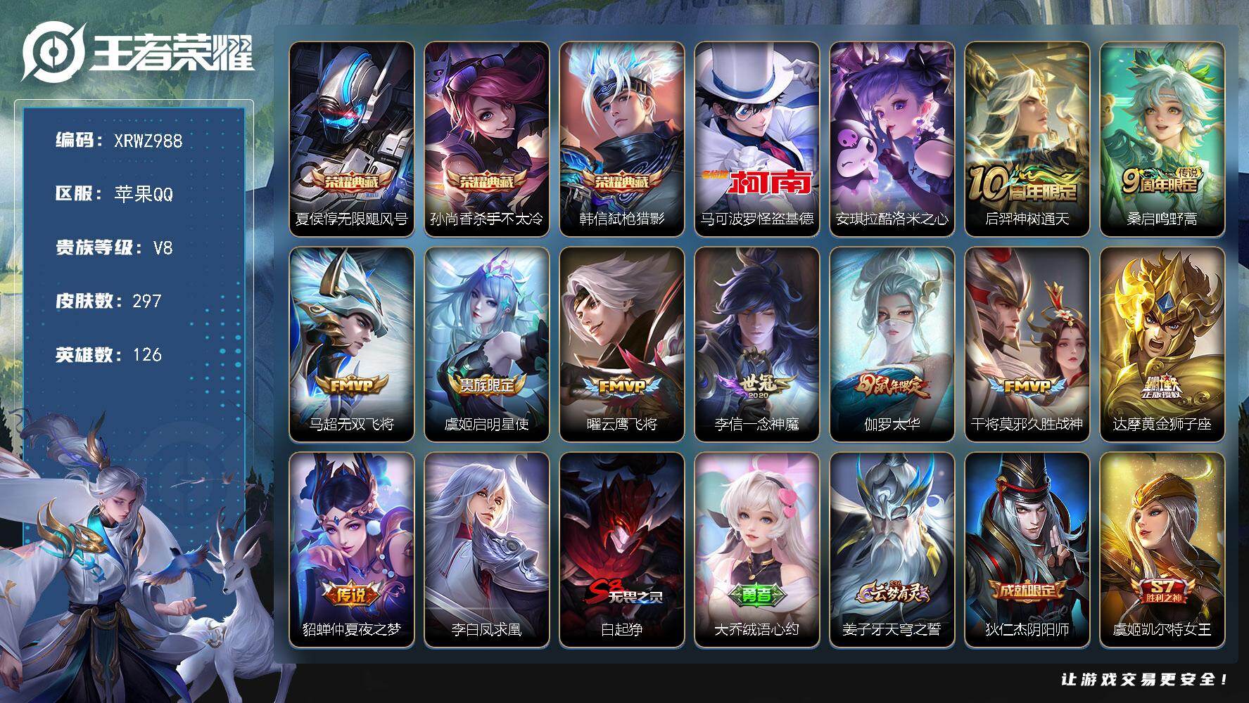 [15490277]Xr44158-苹果Q-无二次-V8-最强王者段位-126英雄-297皮肤-3典藏皮肤-2珍品传说-11传说-75史诗【英雄全皮】:鬼谷子全皮【荣耀典藏】:夏侯惇无限飓风号,孙尚香杀手不太冷,韩信弑枪猎影【珍品传说】:马可波罗怪盗基德,安琪拉酷洛米之心【传说皮肤】:后羿神树通天,桑启鸣野蒿,马超无双飞将,虞姬启明星使,曜云鹰飞将,李信一念神魔,伽罗太华,干将莫邪久胜战神,达摩黄金狮子座,貂蝉仲夏夜之梦,李白凤求凰【限定皮肤】:白起狰,大乔绒语心约,姜子牙天穹之誓,狄仁杰阴阳师,虞姬凯尔特女王,赵云皇家上将,赵云引擎之心,墨子神迹守卫,妲己时之彼端,庄周蜃楼王,庄周高山流水,高渐离死亡摇滚,高渐离玩趣恶龙,钟无艳超时空战士,孙膑妖精王,扁鹊炼金王,白起夜都怪侠,芈月重明,芈月幻夜卜梦,元歌云间偶戏,元歌无心,夏侯惇朔风刀,甄姬游园惊梦,甄姬落雪兰心,曹操烛龙,典韦穷奇,马可波罗暗影游猎,狄仁杰魔术师,狄仁杰万华元夜,达摩星际陆战队,达摩沙漠行僧,项羽海滩派对,老夫子航海奇遇记,程咬金演武夺筹,王昭君午后时光,兰陵王金庭之子,亚瑟狮心王,亚瑟潮玩骑士王,孙悟空至尊宝,后羿圣弓游侠,李元芳银河之约,李元芳云中旅人,虞姬霸王别姬,虞姬启明星使,钟馗驱傩正仪,杨玉环遇见飞天,干将莫邪真爱魔法,雅典娜黎明之约,太乙真人饕餮,鬼谷子原初探秘者,鬼谷子五谷丰年,黄忠火炮绅士,苏烈千军破阵,百里守约朱雀志,弈星混沌棋,梦奇顽趣,沈梦溪大漠名商,明世隐疑决卦,裴擒虎李小龙,裴擒虎擒涛扼浪,狂铁御狮,狂铁电玩高手,米莱狄胡桃异想国,伽罗太华,嫦娥拒霜思,鲁班大师探海日志,桑启海盐诗旅,妲己灵卜魔法,鬼谷子天穹祈灯,刘邦剑破天穹,刘备异域游侠,芈月浮光幕影【年限皮肤】:百里守约朱雀志,李白凤求凰,伽罗太华【赛季限定】:庄周蜃楼王,孙膑妖精王,扁鹊炼金王,白起狰,芈月重明,夏侯惇朔风刀,曹操烛龙,典韦穷奇,狄仁杰万华元夜,达摩沙漠行僧,程咬金演武夺筹,兰陵王金庭之子,亚瑟狮心王,李元芳云中旅人,虞姬凯尔特女王,钟馗驱傩正仪,雅典娜黎明之约,太乙真人饕餮,鬼谷子原初探秘者,苏烈千军破阵,弈星混沌棋,梦奇顽趣,沈梦溪大漠名商,明世隐疑决卦,裴擒虎擒涛扼浪,狂铁御狮,鲁班大师探海日志,桑启海盐诗旅,鬼谷子天穹祈灯,刘邦剑破天穹,姜子牙天穹之誓【战令限定】:墨子神迹守卫,钟无艳超时