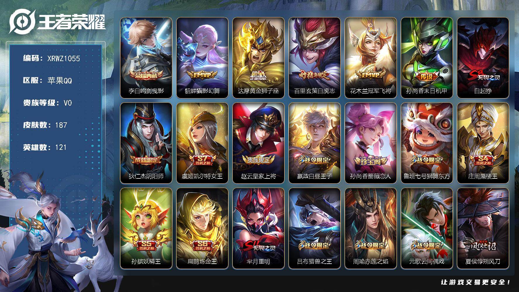 [15562911]Xr48129-可修改苹果Q-V0-尊贵铂金II段位-121英雄-187皮肤-1典藏皮肤-5传说-33史诗【荣耀典藏】:李白鸣剑曳影【传说皮肤】:貂蝉猫影幻舞,达摩黄金狮子座,百里玄策白虎志,花木兰冠军飞将,孙尚香末日机甲【限定皮肤】:白起狰,狄仁杰阴阳师,虞姬凯尔特女王,赵云皇家上将,嬴政白昼王子,孙尚香蔷薇恋人,鲁班七号狮舞东方,庄周蜃楼王,孙膑妖精王,扁鹊炼金王,芈月重明,吕布猎兽之王,周瑜赤莲之焰,元歌云间偶戏,夏侯惇朔风刀,甄姬游园惊梦,曹操烛龙,典韦穷奇,典韦蓝屏警告,狄仁杰魔术师,狄仁杰万华元夜,达摩沙漠行僧,项羽海滩派对,老夫子醍醐杖,关羽冰锋战神,程咬金演武夺筹,兰陵王驯魔猎人,兰陵王金庭之子,花木兰青春决赛季,亚瑟狮心王,亚瑟潮玩骑士王,孙悟空大圣娶亲,牛魔御旌,李元芳云中旅人,钟馗神迹守卫,钟馗驱傩正仪,杨玉环遇见飞天,女娲朔望之晖,蔡文姬繁星吟游,太乙真人饕餮,东皇太一逐梦之光,鬼谷子原初探秘者,鬼谷子五谷丰年,铠青龙志,百里玄策白虎志,弈星混沌棋,沈梦溪大漠名商,明世隐疑决卦,裴擒虎天狼狩猎者,裴擒虎擒涛扼浪,狂铁御狮,米莱狄御霄,盾山御銮,上官婉儿梁祝,鲁班大师探海日志,桑启海盐诗旅,张良古海寻踪,鬼谷子天穹祈灯【年限皮肤】:百里玄策白虎志,铠青龙志【赛季限定】:庄周蜃楼王,孙膑妖精王,扁鹊炼金王,白起狰,芈月重明,夏侯惇朔风刀,曹操烛龙,典韦穷奇,狄仁杰万华元夜,达摩沙漠行僧,老夫子醍醐杖,程咬金演武夺筹,兰陵王金庭之子,张良古海寻踪,亚瑟狮心王,牛魔御旌,李元芳云中旅人,虞姬凯尔特女王,钟馗驱傩正仪,太乙真人饕餮,鬼谷子原初探秘者,弈星混沌棋,沈梦溪大漠名商,明世隐疑决卦,裴擒虎擒涛扼浪,狂铁御狮,米莱狄御霄,盾山御銮,鲁班大师探海日志,桑启海盐诗旅,鬼谷子天穹祈灯【战令限定】:嬴政白昼王子,鲁班七号狮舞东方,吕布猎兽之王,周瑜赤莲之焰,元歌云间偶戏,典韦蓝屏警告,兰陵王驯魔猎人,亚瑟潮玩骑士王,钟馗神迹守卫,女娲朔望之晖【史诗皮肤】:赵云皇家上将,貂蝉圣诞恋歌,狄仁杰魔术师,孙尚香蔷薇恋人,孙尚香水果甜心,妲己魅力维加斯,墨子龙骑士,李白千年之狐,吕布末日机甲,张飞乱世虎臣,韩信白龙吟,关羽冰锋战神,刘邦德古拉伯爵,甄姬游园惊梦,花木兰青春决赛季,铠曙光守护者,李元芳逐浪之夏,白起星夜王子,杨玉环遇见飞天,东皇太一逐