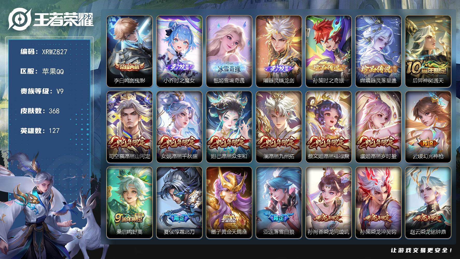 [15563327]xr46043-苹果Q-可二次-V9-至尊星耀III段位-127英雄-368皮肤-1典藏皮肤-3无双-2珍品传说-33传说-110史诗【英雄全皮】:狂铁全皮,孙策全皮,司空震全皮,影全皮【荣耀典藏】:李白鸣剑曳影【无双皮肤】:小乔时之魔女,甄姬雪境奇遇,曜器灵螭龙剑【珍品传说】:孙策时之奇旅,嫦娥器灵落星盏【传说皮肤】:后羿神树通天,司空震愿照山河定,女娲愿照千秋盛,妲己愿照众生和,澜愿照九州拓,蔡文姬愿照福禄聚,虞姬愿照岁时盈,云缨幻光神枪,桑启鸣野蒿,夏侯惇霜北刀,墨子黄金天蝎座,亚连落雪白狼,孙尚香乘龙问璇玑,孙策乘龙淬吴钩,赵云乘龙铭钟鼎,干将莫邪画中仙,马超无双飞将,孙策挚爱之约,露娜启示之音,孙策末日机甲,鲁班七号寅虎瑞焰,貂蝉遇见胡旋,赵云淬星耀世,铠绛天战甲,镜炽阳神光,虞姬启明星使,曜云鹰飞将,李信一念神魔,干将莫邪久胜战神,百里玄策白虎志,后羿黄金射手座,诸葛亮武陵仙君,狄仁杰超时空战士【限定皮肤】:白起狰,夏侯惇霜北刀,蒙犽顽岩魄,蔡文姬夏日便利店,大乔绒语心约,虞姬夏日便利店,姜子牙天穹之誓,狄仁杰阴阳师,虞姬凯尔特女王,廉颇寅虎御盾,赵云皇家上将,赵云引擎之心,赵云百木心枪,墨子神迹守卫,嬴政优雅恋人,嬴政白昼王子,鲁班七号寅虎瑞焰,庄周蜃楼王,孙膑妖精王,扁鹊炼金王,白起夜都怪侠,芈月重明,吕布猎兽之王,吕布御风骁将,周瑜赤莲之焰,元歌云间偶戏,元歌无心,夏侯惇朔风刀,夏侯惇匿光决锋者,甄姬游园惊梦,曹操烛龙,典韦穷奇,典韦蓝屏警告,马可波罗暗影游猎,狄仁杰魔术师,狄仁杰万华元夜,达摩沙漠行僧,项羽海滩派对,老夫子醍醐杖,老夫子航海奇遇记,关羽冰锋战神,貂蝉遇见胡旋,程咬金演武夺筹,露娜启示之音,韩信逐梦之影,王昭君午后时光,兰陵王金庭之子,花木兰默契交锋,亚瑟潮玩骑士王,孙悟空至尊宝,牛魔御旌,后羿圣弓游侠,刘备百相守梦,李元芳银河之约,虞姬启明星使,钟馗驱傩正仪,杨玉环遇见飞天,女娲朔望之晖,干将莫邪画中仙,雅典娜单词大作战,雅典娜黎明之约,蔡文姬繁星吟游,太乙真人饕餮,鬼谷子原初探秘者,鬼谷子五谷丰年,诸葛亮武陵仙君,苏烈千军破阵,百里玄策白虎志,百里玄策原初追逐者,弈星混沌棋,梦奇顽趣,公孙离蜜橘之夏,沈梦溪星空之诺,明世隐疑决卦,明世隐吟游魔法,裴擒虎李小龙,狂铁御狮,狂铁电玩高手,米莱狄御霄,云中君纤云弄巧,伽罗