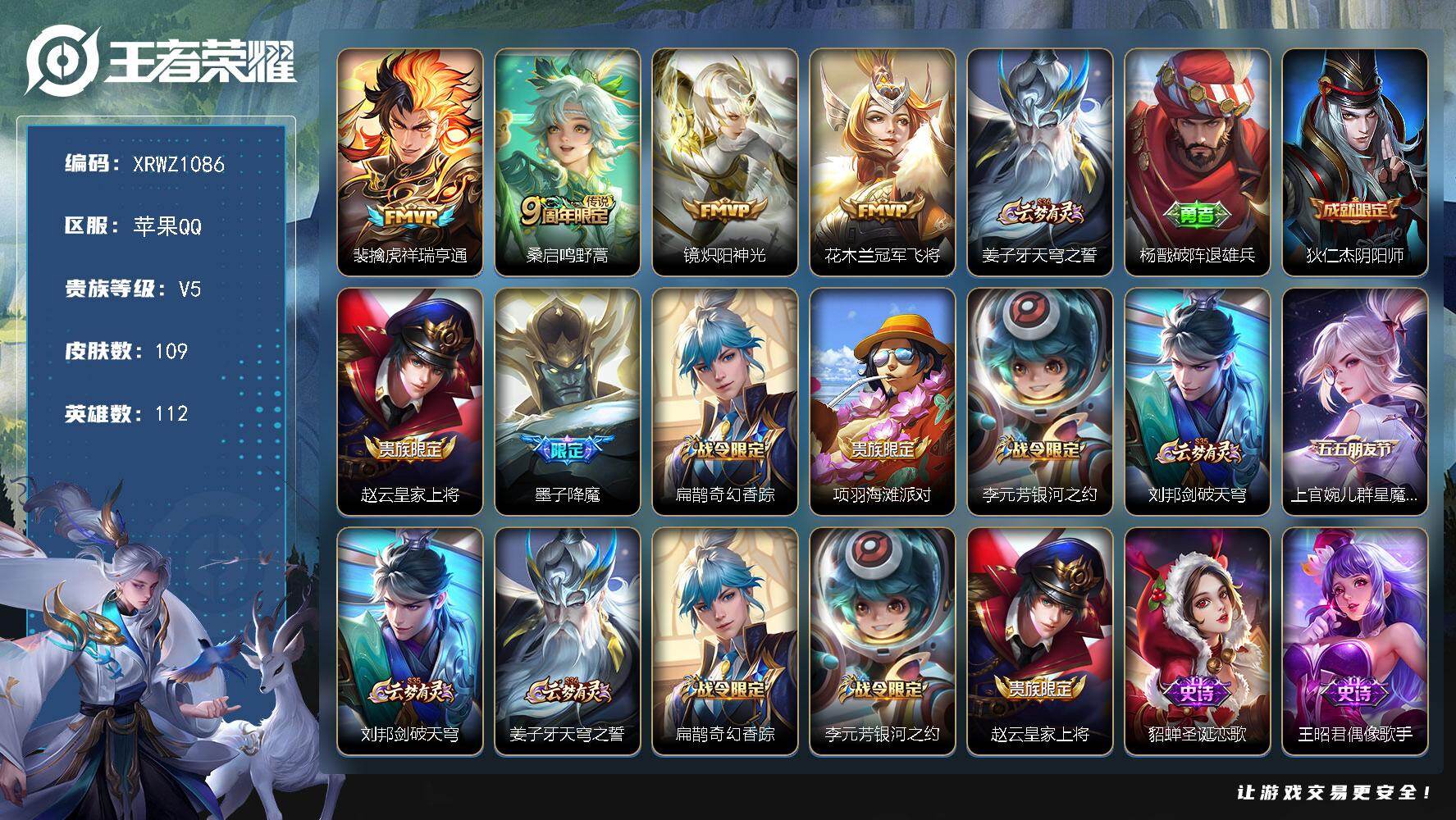 [15836285]Xr47389-可修改苹果Q-V5-最强王者段位-112英雄-109皮肤-4传说-35史诗【英雄全皮】:空空儿全皮【传说皮肤】:裴擒虎祥瑞亨通,桑启鸣野蒿,镜炽阳神光,花木兰冠军飞将【限定皮肤】:姜子牙天穹之誓,杨戬破阵退雄兵,狄仁杰阴阳师,赵云皇家上将,墨子降魔,扁鹊奇幻香踪,项羽海滩派对,李元芳银河之约,刘邦剑破天穹,上官婉儿群星魔术团【赛季限定】:刘邦剑破天穹,姜子牙天穹之誓【战令限定】:扁鹊奇幻香踪,李元芳银河之约【史诗皮肤】:赵云皇家上将,貂蝉圣诞恋歌,王昭君偶像歌手,宫本武藏鬼剑武藏,孙尚香水果甜心,墨子金属风暴,吕布圣诞狂欢,张飞乱世虎臣,花木兰水晶猎龙者,刘邦德古拉伯爵,夏侯惇乘风破浪,小乔缤纷独角兽,兰陵王暗隐猎兽者,雅典娜冰冠公主,安琪拉心灵骇客,百里守约特工魅影,铠曙光守护者,李元芳逐浪之夏,狄仁杰鹰眼统帅,李元芳银河之约,娜可露露晚萤,小乔青蛇,钟馗乐园奇幻夜,墨子降魔,扁鹊奇幻香踪,上官婉儿群星魔术团,廉颇撼地雄心,亚连破空之剑,孙膑茶境仙,阿轲化蝶舞,刘禅鸭鸭历险记,狂铁龙之律动,后羿石田雨龙,周瑜百相守梦,黄忠百相守梦【其他皮肤】:项羽海滩派对,韩信教廷特使,赵云忍炎影,白起白色死神,武则天东方不败,扁鹊救世之瞳,孙膑天使之翼,姜子牙时尚教父,典韦黄金武士,达摩拳王,甄姬花好人间,狄仁杰阴阳师,关羽龙腾万里,钟无艳海滩丽影,孙尚香沉稳之力,李白敏锐之力,鬼谷子幻乐之宴,鲁班大师乓乓大师,典韦铁甲之心,马可波罗潮玩牛仔,米莱狄契约魔法,蒙恬蔚蓝守将,李元芳妄想特派,亚连破局者,刘邦剑破天穹,大司命暗都幽影,杨戬破阵退雄兵,貂蝉长夏之忆,姜子牙天穹之誓,孙悟空神迹守卫,盘古敬我三分,东皇太一噬灭天穹,干将莫邪雾都夜雨,苍苍林狼骑,太乙真人谧流熔炉,典韦铁骨偃魂,马超访茗客,西施雪境奇遇,姜子牙星梦巡礼,明世隐景韶洛都,戈娅玫蓝誓约,刘备浪漫序章,钟馗虚灵犬护,沈梦溪鸭鸭历险记,苏烈春野闲踪,张良灵野札记,阿古朵布丁狗之约,露娜命运加冕,姬小满小满鸭,甄姬逆浪荇歌,云中君云械蓝图,孙策百相守梦,庄周锦麟游梦,空空儿戏梦巡演,莱西奥踏浪烽翎,曹操逐霄之志,项羽帝国元帅,张良一千零一夜,孙悟空西部大镖客,妲己仙境爱丽丝,马可波罗激情绿茵,苍维京掠夺者,杨戬埃及法老,铠龙域领主,元歌午夜歌剧院,李信灼热之刃,瑶森,镜冰刃幻境,澜孤猎王者荣耀 - QQ(苹果) -