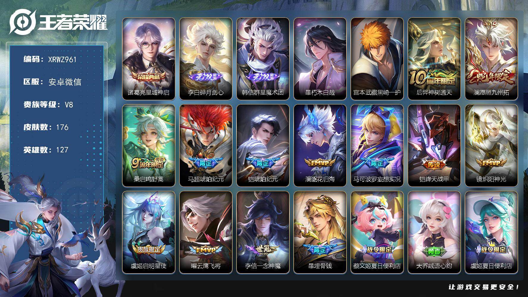 [15931414]Xr45199-安卓WX-无二次-V8-永恒钻石I段位-127英雄-176皮肤-1典藏皮肤-2无双-2珍品传说-12传说-48史诗【英雄全皮】:空空儿全皮【荣耀典藏】:诸葛亮星域神启【无双皮肤】:李白碎月剑心,韩信群星魔术团【珍品传说】:暃朽木白哉,宫本武藏黑崎一护【传说皮肤】:后羿神树通天,澜愿照九州拓,桑启鸣野蒿,马超琥珀纪元,铠琥珀纪元,澜逐花归海,马可波罗妄想实况,铠绛天战甲,镜炽阳神光,虞姬启明星使,曜云鹰飞将,李信一念神魔【限定皮肤】:暃埋骨钱,蔡文姬夏日便利店,大乔绒语心约,虞姬夏日便利店,姜子牙天穹之誓,狄仁杰阴阳师,赵云皇家上将,赵云引擎之心,孙尚香蔷薇恋人,孙膑寅虎展翼,吕布猎兽之王,元歌云间偶戏,马可波罗山海玄木吟,马可波罗妄想实况,狄仁杰魔术师,项羽海滩派对,孙悟空孙行者,后羿辉光之辰,虞姬启明星使,铠青龙志,裴擒虎李小龙,云中君纤云弄巧,嫦娥拒霜思,鲁班大师探海日志,戈娅驭风魔法,艾琳流音漫舞,司空震地狱燃心,阿古朵江河有灵,张良古海寻踪,蒙犽百解令,高渐离燃音魔法,妲己灵卜魔法,鬼谷子天穹祈灯,李白碎月剑心,铠琥珀纪元,马超琥珀纪元,百里玄策超元猎域,沈梦溪龙舞盛年,鲁班七号蔬乡物语,李元芳蔬乡物语,刘邦剑破天穹,程咬金群星魔术团,韩信群星魔术团,镜青焰无极,项羽苍威无极,刘备异域游侠,周瑜熔金海岸【年限皮肤】:铠青龙志,孙膑寅虎展翼,后羿辉光之辰,马可波罗山海玄木吟【赛季限定】:张良古海寻踪,鲁班大师探海日志,鬼谷子天穹祈灯,刘邦剑破天穹,姜子牙天穹之誓【战令限定】:蔡文姬夏日便利店,虞姬夏日便利店,吕布猎兽之王,元歌云间偶戏,艾琳流音漫舞,司空震地狱燃心,戈娅驭风魔法,高渐离燃音魔法,妲己灵卜魔法,鲁班七号蔬乡物语,李元芳蔬乡物语,镜青焰无极,项羽苍威无极【史诗皮肤】:赵云皇家上将,赵云未来纪元,甄姬冰雪圆舞曲,王昭君偶像歌手,狄仁杰魔术师,宫本武藏鬼剑武藏,孙尚香蔷薇恋人,孙尚香水果甜心,嬴政暗夜贵公子,妲己魅力维加斯,刘禅绅士熊喵,赵云引擎之心,小乔缤纷独角兽,兰陵王暗隐猎兽者,亚瑟心灵战警,雅典娜冰冠公主,后羿辉光之辰,铠曙光守护者,蔡文姬舞动绿茵,阿轲节奏热浪,孙策猫狗日记,铠青龙志,伽罗箭羽风息,狄仁杰鹰眼统帅,小乔青蛇,裴擒虎李小龙,云中君纤云弄巧,元歌云间偶戏,孙悟空孙行者,嫦娥拒霜思,孙膑寅虎展翼王者荣耀 - 微信(安卓) -